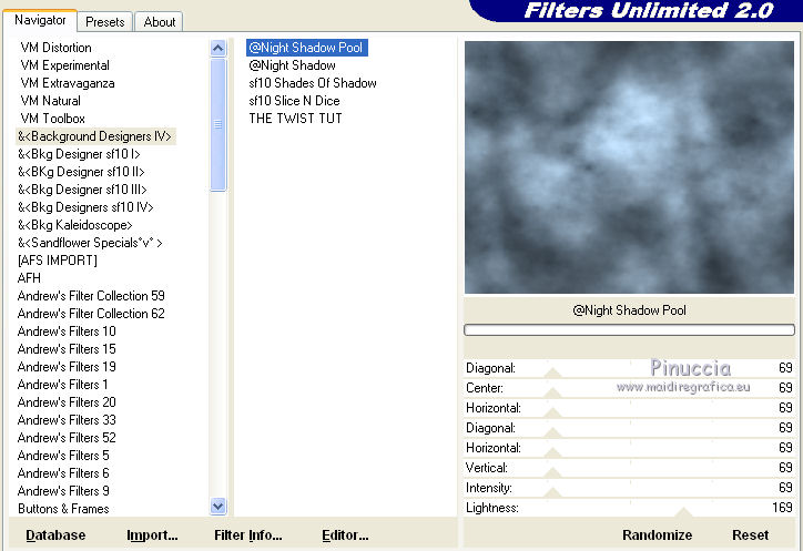 14. Effetti>Plugins>Filters Unlimited 2.0 - Background Designer IV - Night Shadow Pool, con i settaggi standard.