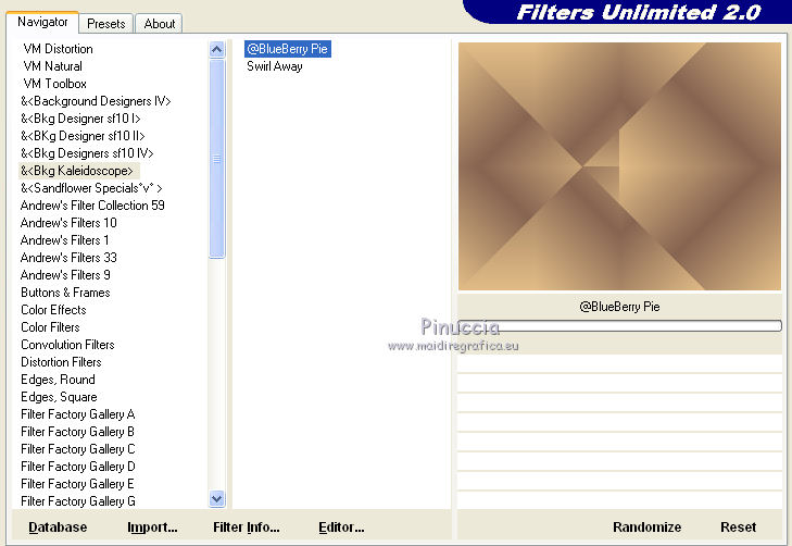 4. Effetti>Plugins>Filters Unlimited - &<Bkg Kaleidoscope> - @Blueberry Pie, con i settaggi standard.