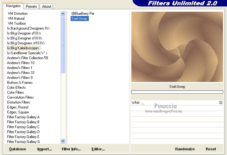 5. Effetti>Plugins>Filters Unlimited - &<Bkg Kaleidoscope> - Swirl away, con i settaggi standard.