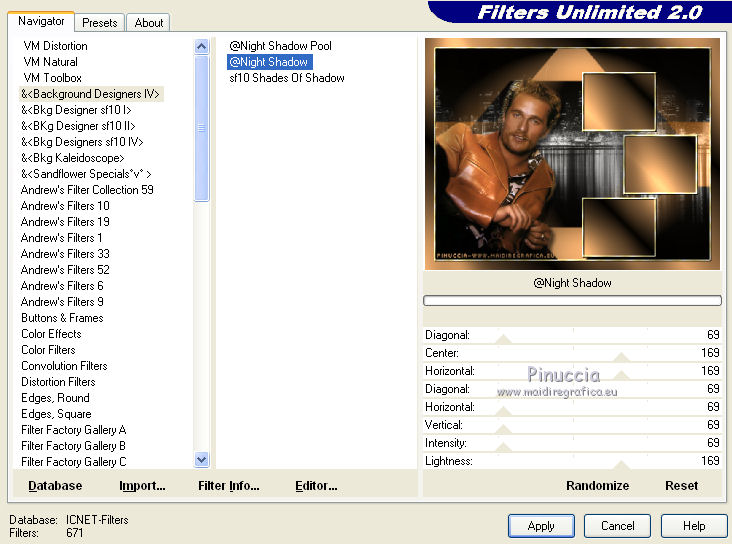 34. Effetti>Plugins>Filters Unlimited - Background Designers IV - Night Shadow, con i settaggi standard.