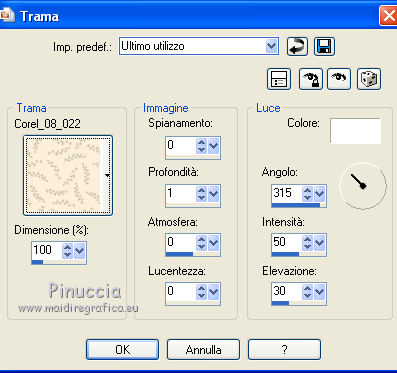 5. Effetti>Effetti di trama>Trama - seleziona la trama Corel_08_022 con i seguenti settaggi.