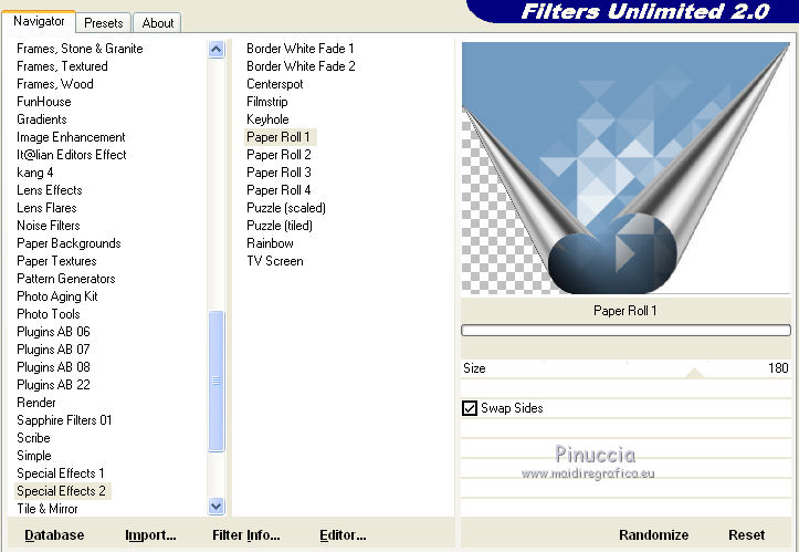 6. Effetti>Plugins>Filters Unlimited 2.0 - Special Effects 2 - Paper Roll 1, con i settaggi standard.