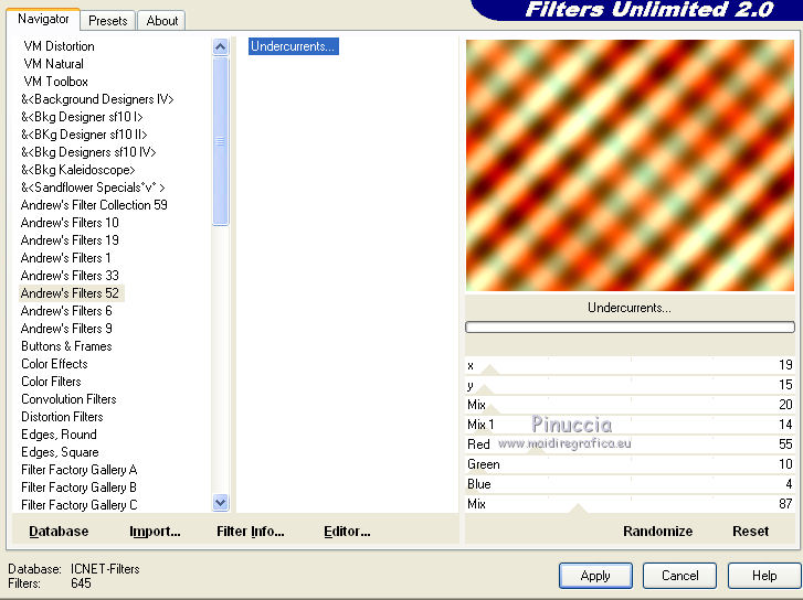 14. Effetti>Plugins>Filters Unlimited - Andrew's Filter 52 - Undercurrents, con i settaggi standard.
