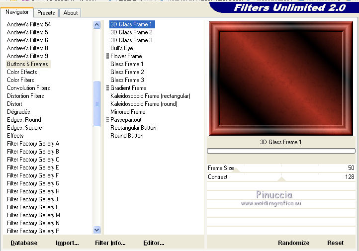 20. Effetti>Plugins>Filters Unlimited 2.0 - Buttons and Frames - 3D Glass Frame 1, con i settaggi standard.