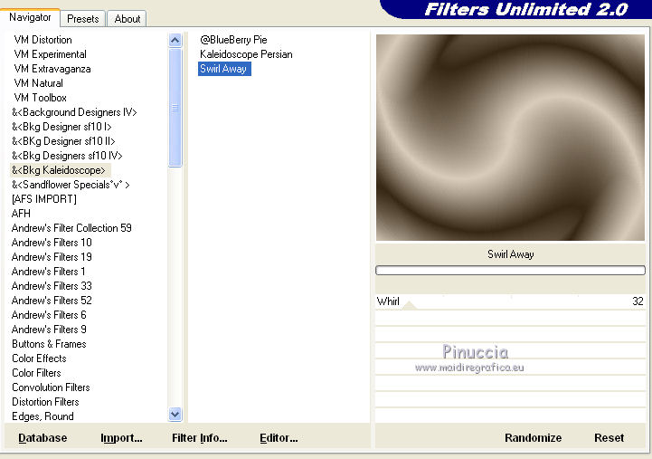 14. Effetti>Plugins>Filters Unlimited - Bkg Kaleidoscope - Swirl away, con i settaggi standard.