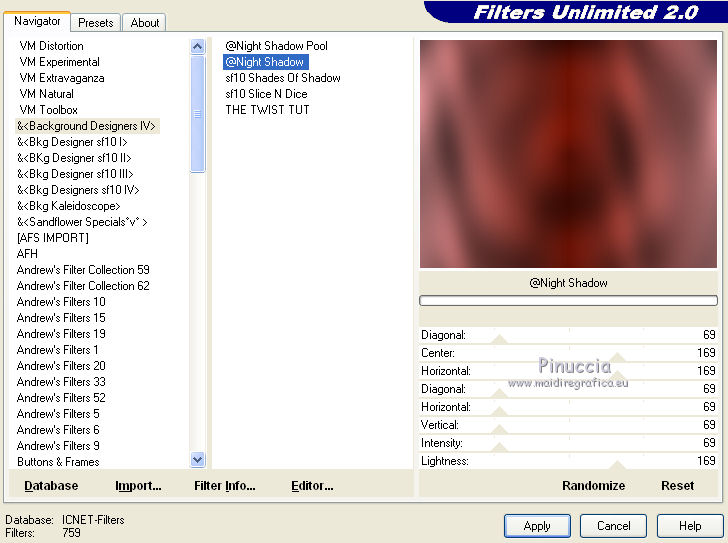 11. Effetti>Plugins>Filters Unlimited 2.0 - Background Designer IV- Nigh shadow, con i settaggi standard.