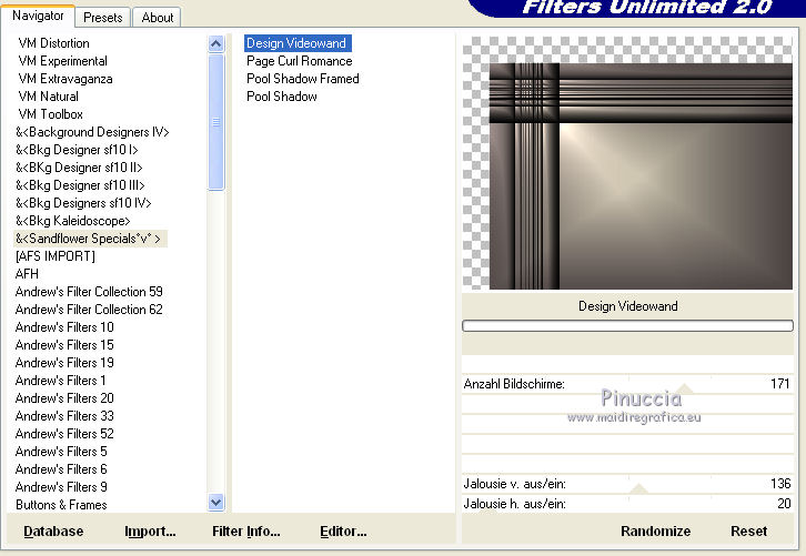 5. Effetti>Plugins>Filters Unlimited 2.0 - Sandflowers special - Design Videowand, con i settaggi standard.