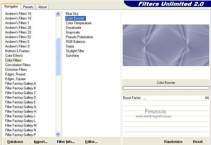 8. Effetti>Plugins>Filters Unlimited - Color filters - Color booster, con i settaggi standard.