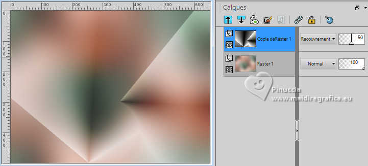 6. Placer le calque en mode Recouvrement et réduire l'opacité à 50%.