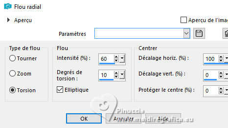 Effets>Modules Externes>Filters Unlimited 2.0 - Tile & Mirror - Radial Mirror, par défaut.