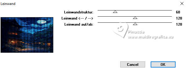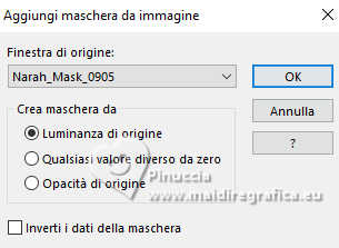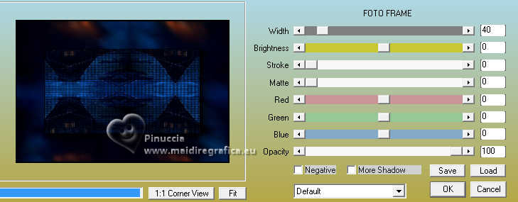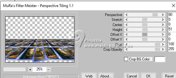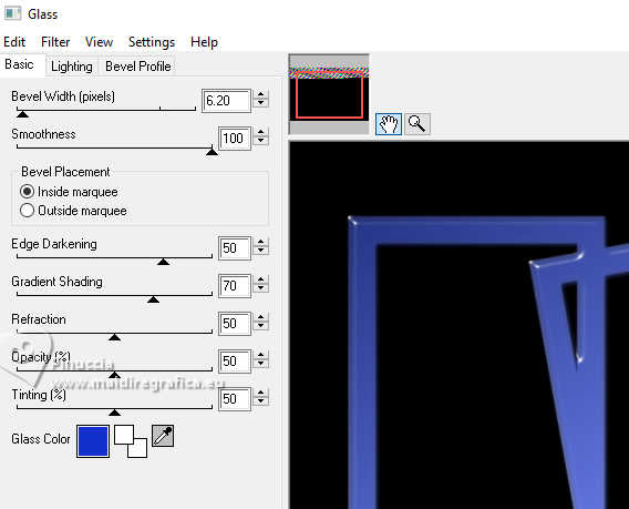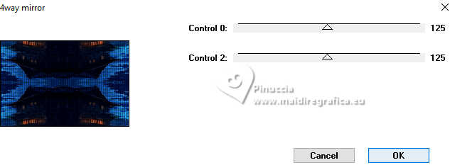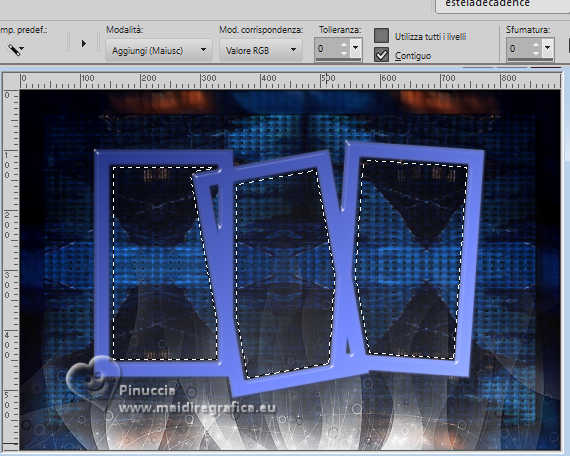 qui puoi trovare qualche risposta ai tuoi dubbi. Se l'argomento che ti interessa non è presente, ti prego di segnalarmelo. Questo tutorial è stato realizzato con PSP2020 e tradotto con PSPX9 e PSP2020, ma può essere eseguito anche con le altre versioni di PSP. Dalla versione X4, il comando Immagine>Rifletti è stato sostituito con Immagine>Capovolgi in orizzontale, e il comando Immagine>Capovolgi con Immagine>Capovolgi in verticale. Nelle versioni X5 e X6, le funzioni sono state migliorate rendendo disponibile il menu Oggetti. Con la nuova versione X7, sono tornati Rifletti>Capovolgi, ma con nuove varianti. Vedi la scheda sull'argomento qui ![]() Occorrente: 2 immagini 1 tube principale. Il resto del materiale ![]() (in questa pagina trovi i links ai siti dei creatori di tubes) Filtri: se hai problemi con i filtri, consulta la mia sezione filtri qui Filters Unlimited 2.0 qui AAA Frames - Foto Frame qui Kiwi's Oelfilter qui Eye Candy 4000 qui Mura's Meister qui Scribe qui ![]() non esitare a cambiare modalità di miscelatura e opacità secondo i colori utilizzati. Nelle ultime versioni di PSP non c'è il gradiente di primo piano/sfondo (Corel_06_029) Puoi usare i gradienti delle versioni precedenti. Trovi qui i gradienti Corel X. ![]() Apri le maschere in PSP e minimizzale con il resto del materiale. 1. Apri una nuova immagine trasparente 900 x 600 pixels. 2. Selezione>Seleziona tutto. Copia la tua immagine e vai a Modifica>Copia. Torna al tuo lavoro e vai a Modifica>Incolla nella selezione. Selezione>Deseleziona. 3. Effetti>Plugins>Kiwi's Oelfilter - Leinwand, con i settaggi standard. ![]() 4. Effetti>Plugins>Scribe - 4Way Mirror. ![]() 5. Effetti>Effetti di immagine>Motivo unico, Fianco a fianco. ![]() 6. Effetti>Plugins>AAA Frames - Foto Frame. ![]() 7. Livelli>Nuovo livello raster. Riempi il livello con il colore bianco.8. Livelli>Nuovo livello maschera>Da immagine. Apri il menu sotto la finestra di origine e vedrai la lista dei files aperti. Seleziona la maschera Narah_Mask_0905.jpg ![]() 9. Effetti>Effetti di bordo>Aumenta. Livelli>Unisci>Unisci gruppo. 10. Apri Frame Quadro ![]() Modifica>Copia. Torna al tuo lavoro e vai a Modifica>Incolla come nuovo livello. 11. Effetti>Plugins>Eye Candy 4000 - Glass. Glass color #1330cc - puoi cambiare il colore secondo la tua immagine. ![]() 12. Attiva lo strumento Bacchetta magica , modalità Aggiungiclicca nelle cornici per selezionarle. ![]() 13. Selezione>Modifica>Espandi - 12 pixels. 14. Mantieni selezionato. Livelli>Nuovo livello raster. Livelli>Disponi>Sposta giù. 15. Copia la tua seconda immagine e vai a Modifica>Copia. Torna al tuo lavoro e vai a Modifica>Incolla nella selezione. Selezione>Deseleziona. 16. Attiva il livello superiore. Livelli>Unisci>Unisci giù. 17. Livelli>Duplica. Chiudi questo livello e attiva il livello sottostante. 18. Effetti>Plugins>Mura's Meister - Perspective Tiling. ![]() 19. Cambia la modalità di miscelatura di questo livello in Filtra, o secondo i tuoi colori. 20. Riapri e attiva il livello superiore. Apri Flechas-by Elaine.png ![]() Modifica>Copia. Torna al tuo lavoro e vai a Modifica>Incolla come nuovo livello. Immagine>Ridimensiona, al 70%, tutti i livelli non selezionato. E' al suo posto. ![]() 21. Apri il tuo tube e vai a Modifica>Copia. Torna al tuo lavoro e vai a Modifica>Incolla come nuovo livello. 22. Apri il testo frase abraço ![]() Modifica>Copia. Torna al tuo lavoro e vai a Modifica>Incolla come nuovo livello. (Nota di Elaine: mantieni esattamente la frase come sta, non modificarla). 23. Immagine>Aggiungi bordatura, 5 pixels, simmetriche, colore bianco. Firma il tuo lavoro e salva in formato jpg. Per i tubes di questi esempi grazie Tatty Thingies ![]() ![]() Le vostre versioni. Grazie![]() Tosca dei gatti ![]() Marygraphics ![]() Puoi scrivermi se hai problemi o dubbi, o trovi un link che non funziona, o soltanto per un saluto. |