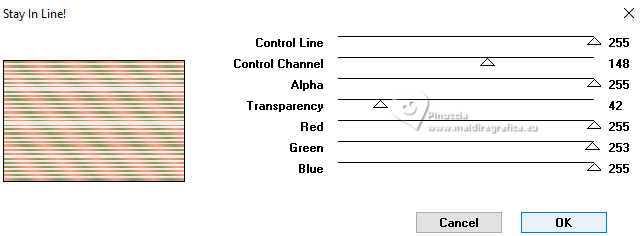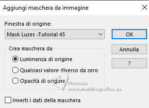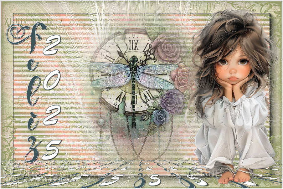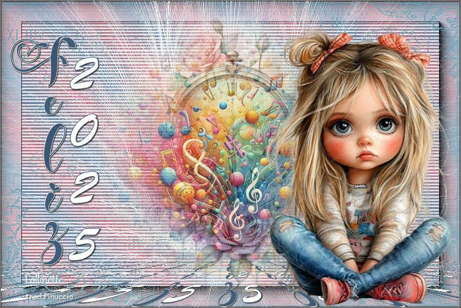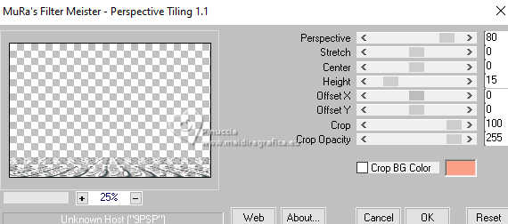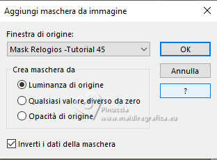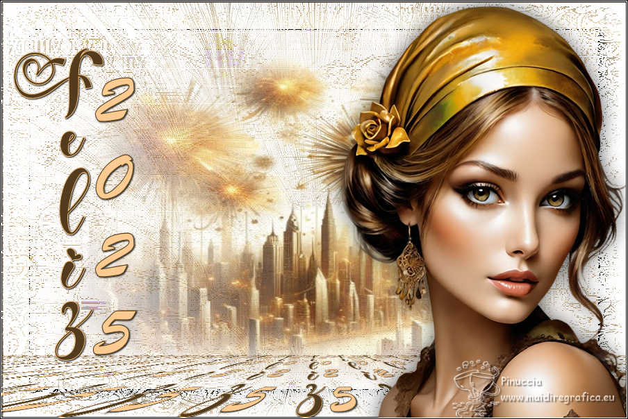 qui puoi trovare qualche risposta ai tuoi dubbi. Se l'argomento che ti interessa non è presente, ti prego di segnalarmelo. Questo tutorial è stato realizzato con PSP2020 e tradotto con PSPX9 e PSP2020, ma può essere eseguito anche con le altre versioni di PSP. Dalla versione X4, il comando Immagine>Rifletti è stato sostituito con Immagine>Capovolgi in orizzontale, e il comando Immagine>Capovolgi con Immagine>Capovolgi in verticale. Nelle versioni X5 e X6, le funzioni sono state migliorate rendendo disponibile il menu Oggetti. Con la nuova versione X7, sono tornati Rifletti>Capovolgi, ma con nuove varianti. Vedi la scheda sull'argomento qui ![]() Occorrente: 1 misted 1 Tube Il resto del materiale ![]() (in questa pagina trovi i links ai siti dei creatori di tubes) Filtri: se hai problemi con i filtri, consulta la mia sezione filtri qui Filters Unlimited 2.0 qui VM Extravaganza - Stay in lines qui AAA Frames - Foto Frame qui Mura's Meister - Perspective Tiling qui I filtri VM Extravaganza si possono usare da soli o importati in Filters Unlimited (come fare vedi qui) Se un filtro fornito appare con questa icona ![]() non esitare a cambiare modalità di miscelatura e opacità secondo i colori utilizzati. ![]() 1. Apri una nuova immagine trasparente 900 x 600 pixels. 2. Scegli due colori; per l'esempio: Imposta il colore di primo piano con #8d955a, e il colore di sfondo con #faa088. ![]() 3. Passa il colore di primo piano a Gradiente di primo piano/sfondo, stile Lineare. ![]() Riempi l'immagine trasparente con il gradiente.4. Effetti>Plugins>VM Extravaganza - Stay in Line. ![]() 5. Effetti>Plugins>AAA Frames - Foto Frame. ![]() 6. Livelli>Nuovo livello raster. Passa il colore di primo piano a Colore. Riempi il livello con il colore di primo piano #8d955a.7. Livelli>Nuovo livello maschera>Da immagine. Apri il menu sotto la finestra di origine e vedrai la lista dei files aperti. Seleziona la maschera Mask Relogios-Tutorial45 ![]() Effetti>Effetti di bordo>Aumenta. Livelli>Unisci>Unisci gruppo. 8. Livelli>Nuovo livello raster. Imposta il colore di primo piano con il colore bianco. Riempi il livello con il colore bianco.9. Livelli>Nuovo livello maschera>Da immagine. Apri il menu sotto la finestra di origine e seleziona la maschera Mask Luzes-Tutorial45 ![]() Effetti>Effetti di bordo>Aumenta - 2 volte. Livelli>Unisci>Unisci gruppo. 10. Apri il tuo misted e vai a Modifica>Copia. Torna al tuo lavoro e vai a Modifica>Incolla come nuovo livello. 11. Apri il tube FRASE - FELIZ 2025-Tutorial 45 ![]() Modifica>Copia. Torna al tuo lavoro e vai a Modifica>Incolla come nuovo livello. 12. Attiva lo strumento Puntatore .Puntatore X: 16,00 - Posizione Y: 65,00. ![]() 13. Livelli>Duplica. Attiva il livello sottostante dell'originale. 14. Effetti>Plugins>Mura's Meister - Perspective Tiling. ![]() 15. Attiva nuovamente il livello superiore. Apri il tuo tube e vai a Modifica>Copia. Torna al tuo lavoro e vai a Modifica>Incolla come nuovo livello. 16. Immagine>Aggiungi bordatura, 1 pixel, simmetriche, colore bianco. Immagine>Aggiungi bordatura, 1 pixel, simmetriche, colore nero. 17. Firma il tuo lavoro e salva in formato jpg. Per il tube di questo esempio grazie Laurette ![]() ![]() Le vostre versioni. Grazie![]() Irene ![]() Follinette ![]() Puoi scrivermi se hai problemi o dubbi, o trovi un link che non funziona, o soltanto per un saluto. |