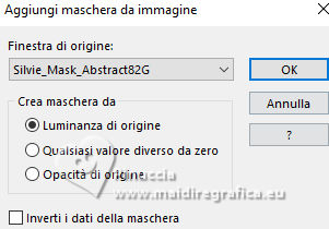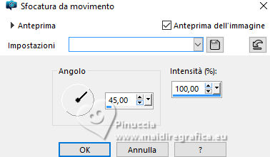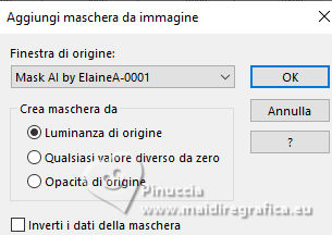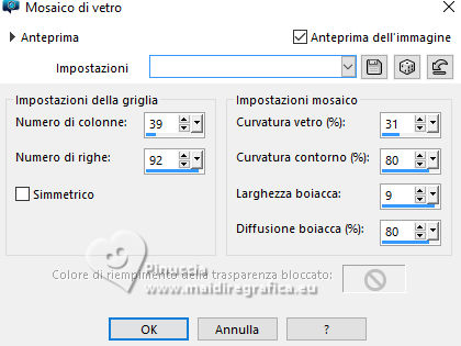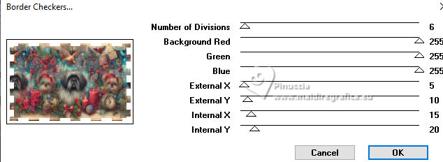 qui puoi trovare qualche risposta ai tuoi dubbi. Se l'argomento che ti interessa non è presente, ti prego di segnalarmelo. Questo tutorial è stato realizzato con PSP2020 e tradotto con PSPX9 e PSP2020, ma può essere eseguito anche con le altre versioni di PSP. Dalla versione X4, il comando Immagine>Rifletti è stato sostituito con Immagine>Capovolgi in orizzontale, e il comando Immagine>Capovolgi con Immagine>Capovolgi in verticale. Nelle versioni X5 e X6, le funzioni sono state migliorate rendendo disponibile il menu Oggetti. Con la nuova versione X7, sono tornati Rifletti>Capovolgi, ma con nuove varianti. Vedi la scheda sull'argomento qui ![]() Traduzione inglese quiOccorrente: a scelta: 1 immagine giornale o decoupage 1 tube principale. Il resto del materiale ![]() (in questa pagina trovi i links ai siti dei creatori di tubes) Filtri: se hai problemi con i filtri, consulta la mia sezione filtri qui Filters Unlimited 2.0 qui Alf's Border FX - Border Checkers qui I filtri Alf's Border FX si possono usare da soli o importati in Filters Unlimited (come fare vedi qui) Se un filtro fornito appare con questa icona ![]() non esitare a cambiare modalità di miscelatura e opacità secondo i colori utilizzati. ![]() Apri le maschere in PSP e minimizzale con il resto del materiale. 1. Apri una nuova immagine sfondo bianco 900 x 600 pixels. 2. Selezione>Seleziona tutto. Apri il tuo decoupage e vai a Modifica>Copia. Torna al tuo lavoro e vai a Modifica>Incolla nella selezione. Selezione>Deseleziona. 3. Effetti>Effetti di immagine>Motivo unico - fianco a fianco. ![]() 4. Effetti>Plugins>Alf's Border FX - Border Checkers, con i settaggi standard. ![]() 5. Attiva lo strumento Bacchetta magica ![]() e clicca nella parte bianca per selezionarla. Livelli>Nuovo livello raster. 6. Scegli e imposta il colore di primo piano con un colore dalla tua immagine, per me #248188. Imposta il colore di sfondo con il colore bianco. ![]() Riempi la selezione con il colore di primo piano.Selezione>Deseleziona. 7. Effetti>Effetti di trama>Mosaico di vetro. ![]() 8. Attiva il livello di sfondo. Regola>Sfocatura>Sfocatura da movimento. ![]() 9. Attiva il livello superiore. Livelli>Nuovo livello raster. Riempi il livello con il colore bianco di sfondo.10. Livelli>Nuovo livello maschera>Da immagine. Apri il menu sotto la finestra di origine e vedrai la lista dei files aperti. Seleziona la maschera Mask AI by ElaineA-0001 ![]() Effetti>Effetti di bordo>Aumenta. Livelli>Unisci>Unisci gruppo. 11. Effetti>Effetti 3D>Sfalsa ombra, colore nero. ![]() 12. Livelli>Unisci>Unisci tutto. 13. Livelli>Duplica - 2 volte. 14. Attiva il livello della prima copia. Immagine>Ridimensiona, all'80%, tutti i livelli non selezionato. Effetti>Effetti 3D>Sfalsa ombra, con i settaggi precedenti. 15. Attiva il livello superiore della seconda copia. Immagine>Ridimensiona, al 60%, tutti i livelli non selezionato. Effetti>Effetti 3D>Sfalsa ombra, con i settaggi precedenti. 16. Livelli>Nuovo livello raster. Scegli e imposta come colore di primo piano un altro colore abbinato al tuo lavoro; per me #b06966. ![]() Riempi il livello con il colore di primo piano.17. Livelli>Nuovo livello maschera>Da immagine. Apri il menu sotto la finestra di origine e seleziona la maschera Silvie_Mask_Abstract82G ![]() Effetti>Effetti di bordo>Aumenta di più. Livelli>Unisci>Unisci gruppo. 18. Livelli>Unisci>Unisci tutto. 19. Apri il tuo tube e vai a Modifica>Copia. Torna al tuo lavoro e vai a Modifica>Incolla come nuovo livello. Immagine>Ridimensiona, se necessario. Posiziona correttamente il tube.Effetti>Effetti 3D>Sfalsa ombra a scelta. 20. Apri il wordart Frase Holly Jolly AI by Elaine ![]() Modifica>Copia. Torna al tuo lavoro e vai a Modifica>Incolla come nuovo livello. Per il mio esempio ho ridimensionato il tube al 70%, tutti i livelli non selezionato. Posiziona il tube a tuo piacimento.21. Immagine>Aggiungi bordatura, 2 pixels, simmetriche, con un colore in armonia con il tuo lavoro. 22. Firma il tuo lavoro e salva in formato jpg. Versione con un mio tube da immagine Pinterest ![]() ![]() Le vostre versioni. ![]() Maryland ![]() Lady Valella ![]() Marygraphics ![]() Puoi scrivermi se hai problemi o dubbi, o trovi un link che non funziona, o soltanto per un saluto. |