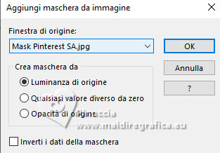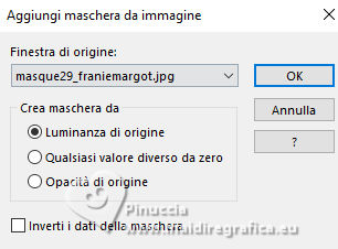 qui puoi trovare qualche risposta ai tuoi dubbi. Se l'argomento che ti interessa non è presente, ti prego di segnalarmelo. Questo tutorial è stato realizzato con PSP2020 e tradotto con PSPX9 e PSP2020, ma può essere eseguito anche con le altre versioni di PSP. Dalla versione X4, il comando Immagine>Rifletti è stato sostituito con Immagine>Capovolgi in orizzontale, e il comando Immagine>Capovolgi con Immagine>Capovolgi in verticale. Nelle versioni X5 e X6, le funzioni sono state migliorate rendendo disponibile il menu Oggetti. Con la nuova versione X7, sono tornati Rifletti>Capovolgi, ma con nuove varianti. Vedi la scheda sull'argomento qui ![]() Traduzione inglese quiOccorrente: 1 tube principale. 1 immagine di sfondo Il resto del materiale ![]() (in questa pagina trovi i links ai siti dei creatori di tubes) Filtri se hai problemi con i filtri, consulta la mia sezione filtri qui Filters Unlimited 2.0 qui VM Toolbox - Blast qui Mehdi - Wavy Lab 1.1. qui AAA Frames - Foto Frame qui I filtri VM Toolbox si possono usare da soli o importati in Filters Unlimited (come fare vedi qui) Se un filtro fornito appare con questa icona ![]() non esitare a cambiare modalità di miscelatura e opacità secondo i colori utilizzati. ![]() Apri le maschere in PSP e minimizzale con il resto del materiale. 1. Apri una nuova immagine trasparente 900 x 600 pixels. 2. Scegli 5 colori per lavorare. I miei colori: #a2cad4 - #f999b5 - #f999b5 - #cceed6 - #ffffff ![]() 3. Effetti>Plugins>Wavy Lab 1.1 Sequenza colori #a2cad4 - #f999b5 - #f999b5 - #cceed6 ![]() 4. Effetti>Plugins>Filters Unlimited 2.0 - Distortion Filter - Down the Drain 1 ![]() 5. Livelli>Nuovo livello raster. Effetti>Plugins>Wavy Lab 1.1, con la sequenza di colori in memoria #a2cad4 - #f999b5 - #f999b5 - #cceed6 ![]() 6. Livelli>Nuovo livello maschera>Da immagine. Apri il menu sotto la finestra di origine e vedrai la lista dei files aperti. Seleziona la maschera masque29_franiemargot ![]() Effetti>Effetti di bordo>Aumenta di più. Livelli>Unisci>Unisci gruppo. 7. Effetti>Effetti 3D>Sfalsa ombra ![]() 8. Imposta il colore di primo piano con il colore bianco. Livelli>Nuovo livello raster. Riempi con il colore bianco.9. Livelli>Nuovo livello maschera>Da immagine. Apri il menu sotto la finestra di origine e seleziona la maschera Mask Pinterest SA ![]() Effetti>Effetti di bordo>Aumenta di più. Livelli>Unisci>Unisci gruppo. 10. Attiva lo strumento Bacchetta magica , Aggiungi selezionato![]() 11. Clicca nelle 3 losanghe per selezionarle. ![]() 12. Livelli>Nuovo livello raster. Apri la tua immagine di sfondo e vai a Modifica>Copia. Torna al tuo lavoro e vai a Modifica>Incolla nella selezione. Selezione>Deseleziona. 13. Livelli>Disponi>Sposta giù. 14. Attiva il livello superiore della maschera. Effetti>Effetti 3D>Sfalsa ombra, con i settaggi precedenti. 15. Livelli>Unisci>Unisci giù. Immagine>Ridimensiona, all'80%, tutti i livelli non selezionato. 16. Livelli>Unisci>Unisci tutto. 17. Effetti>Plugins>AAA Frames - Foto Frame. ![]() 18. Apri Enfeite Lateral Tutorial 11 ![]() Modifica>Copia. Torna al tuo lavoro e vai a Modifica>Incolla come nuovo livello. 19. Apri il tuo tube e vai a Modifica>Copia. Torna al tuo lavoro e vai a Modifica>Incolla come nuovo livello. Posiziona il tube a tuo piacimento.20. Livelli>Duplica. Attiva il livello sottostante dell'originale. Effetti>Plguins>Filters Unlimited 2.0 - VM Toolbox - Blast ![]() 21. Attiva il livello superiore della copia. Effetti>Effetti 3D>Sfalsa ombra, colore bianco. ![]() 22. Apri Word Change of Season ![]() Modifica>Copia. Torna al tuo lavoro e vai a Modifica>Incolla come nuovo livello. Posiziona il testo a tuo piacimento.Nel materiale trovi la versione in bianco, che potrai colorare a seconda del tuo lavoro. 23. Immagine>Aggiungi bordatura, 1 pixel, simmetriche, colore nero. 24. Firma il tuo lavoro e salva in formato jpg. Versione con miei tubes da immagini Pinterest ![]() ![]() Le vostre versioni. ![]() Puoi scrivermi se hai problemi o dubbi, o trovi un link che non funziona, o soltanto per un saluto. |
