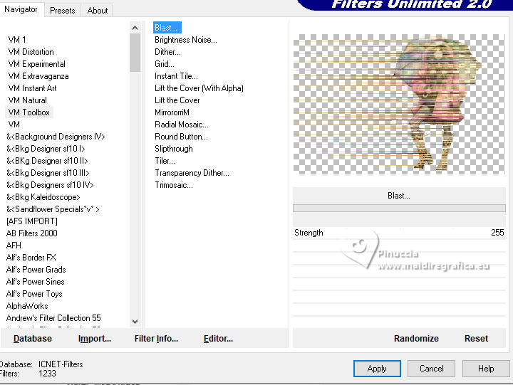 Effects>Plugins>Filters Unlimited 2.0 - VM Toolbox - Blast