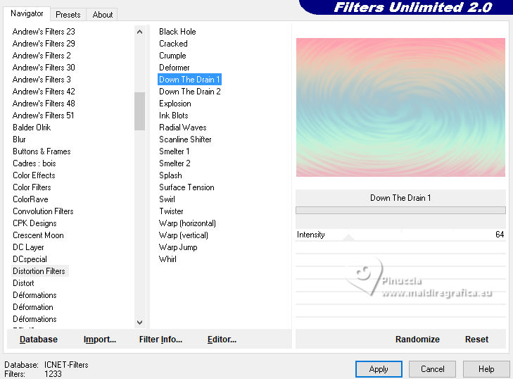 4. Effects>Plugins>Filters Unlimited 2.0 - Distortion Filter - Dow the Drain 1