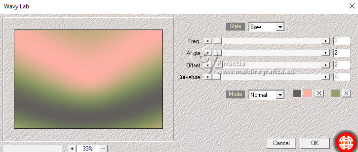 qui puoi trovare qualche risposta ai tuoi dubbi. Se l'argomento che ti interessa non è presente, ti prego di segnalarmelo. Questo tutorial è stato realizzato con PSP2020 e tradotto con PSPX9 e PSP2020, ma può essere eseguito anche con le altre versioni di PSP. Dalla versione X4, il comando Immagine>Rifletti è stato sostituito con Immagine>Capovolgi in orizzontale, e il comando Immagine>Capovolgi con Immagine>Capovolgi in verticale. Nelle versioni X5 e X6, le funzioni sono state migliorate rendendo disponibile il menu Oggetti. Con la nuova versione X7, sono tornati Rifletti>Capovolgi, ma con nuove varianti. Vedi la scheda sull'argomento qui ![]() Occorrente: Un misted e un tube principale. Il resto del materiale ![]() Per il tube del mio esempio grazie Luz Cristina. (in questa pagina trovi i links ai siti dei creatori di tubes) Filtri: se hai problemi con i filtri, consulta la mia sezione filtri qui Filters Unlimited 2.0 qui VM Extravaganza - Stay in line qui Mehdi - Wavy Lab qui Xero XL - Porcelain qui I filtri VM Extravaganza si possono usare da soli o importati in Filters Unlimited (come fare vedi qui) Se un filtro fornito appare con questa icona ![]() non esitare a cambiare modalità di miscelatura e opacità secondo i colori utilizzati. ![]() Apri la maschera in PSP e minimizzala con il resto del materiale. 1. Apri una nuova immagine trasparente 900 x 600 pixels. 2. Scegli 3 colori dal tuo materiale. Colori usati: #feb0a4 - #635f5c - #989c69 ![]() 3. Imposta il colore di primo piano con il colore chiaro feb0a4, e il colore di sfondo con il colore scuro #635f5c. 4. Effetti>Plugins>Mehdi - Wavy Lab Questo filtro creato gradienti con i colori della paletta: il primo è il colore di sfondo, il secondo quello di primo piano. Cambia il terzo colore creato dal filtro con il colore 3 #989c69. ![]() 5. Effetti>Effetti di immagine>Motivo unico - Fianco a fianco. ![]() 6. Effetti>Plugins>VM Extravaganza - Stay in Line ![]() 7. Livelli>Nuovo livello raster. 8. Selezione>Seleziona tutto. 9. Apri il tuo misted e vai a Modifica>Copia. Torna al tuo lavoro e vai a Modifica>Incolla nella selezione. Selezione>Deseleziona. 10. Effetti>Plugins>Xero XL - Porcelain ![]() 11. Livelli>Nuovo livello raster. Riempi il livello con uno dei tuoi colori.Per l'esempio ho usato il colore di primo piano #feb0a4. 12. Livelli>Nuovo livello maschera>Da immagine Apri il menu sotto la finestra di origine e vedrai la lista dei files aperti. Seleziona la maschera mask sem autoria retirada na internet ![]() Effetti>Effetti di bordo>Aumenta. Livelli>Unisci>Unisci gruppo. 13. Effetti>Effetti 3D>Sfalsa ombra, colore bianco. ![]() 14. Apri Elaine_Word Coffee in Paris ![]() Modifica>Copia. Torna al tuo lavoro e vai a Modifica>Incolla come nuovo livello. 15. Immagine>Aggiungi bordatura, 2 pixels, simmetriche, colore di sfondo #635f5c. Immagine>Aggiungi bordatura, 2 pixels, simmetriche, colore di primo piano #feb0a4. Immagine>Aggiungi bordatura, 2 pixels, simmetriche, colore 3 #989c69. Usa i tuoi colori. 16. Apri il tuo tube principale e vai a Modifica>Copia. Torna al tuo lavoro e vai a Modifica>Incolla come nuovo livello. Posiziona il tube a tuo piacimento.Effetti>Effetti 3D>Sfalsa ombra, a scelta. Livelli>Unisci>Unisci giù. 17. Apri Elaine_frase I express myself ![]() Modifica>Copia. Torna al tuo lavoro e vai a Modifica>Incolla come nuovo livello. Posiziona il testo in armonia con il tuo lavoro.18. Immagine>Aggiungi bordatura, 3 pixels, simmetriche, colore bianco #ffffff. 19. Firma il tuo lavoro e salva in formato jpg. ![]() Le vostre versioni. Grazie![]() Marygraphics ![]() Puoi scrivermi se hai problemi o dubbi, o trovi un link che non funziona, o soltanto per un saluto. |
