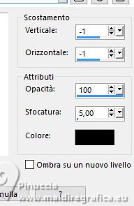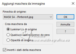 qui puoi trovare qualche risposta ai tuoi dubbi. Se l'argomento che ti interessa non è presente, ti prego di segnalarmelo. Questo tutorial è stato realizzato con PSP2020 e tradotto con PSPX9 e PSP2020, ma può essere eseguito anche con le altre versioni di PSP. Dalla versione X4, il comando Immagine>Rifletti è stato sostituito con Immagine>Capovolgi in orizzontale, e il comando Immagine>Capovolgi con Immagine>Capovolgi in verticale. Nelle versioni X5 e X6, le funzioni sono state migliorate rendendo disponibile il menu Oggetti. Con la nuova versione X7, sono tornati Rifletti>Capovolgi, ma con nuove varianti. Vedi la scheda sull'argomento qui ![]() Traduzione inglese quiOccorrente: 1 immagine 1 tube principale. Il resto del materiale ![]() (in questa pagina trovi i links ai siti dei creatori di tubes) Filtri: se hai problemi con i filtri, consulta la mia sezione filtri qui Filters Unlimited 2.0 qui VM Toolbox - Blast qui VM Extravaganza - James Bondate qui AAA Frames - Foto Frame qui I filtri VM Toolbox e VM Extravaganza si possono usare da soli o importati in Filters Unlimited (come fare vedi qui) Se un filtro fornito appare con questa icona ![]() non esitare a cambiare modalità di miscelatura e opacità secondo i colori utilizzati. ![]() Apri le maschera in PSP e minimizzale con il resto del materiale. 1. Apri una nuova immagine trasparente 900 x 600 pixels. 2. Scegli un colore della tua immagine e impostalo come colore di primo piano. Io ho usato: #fcddc8. Imposta il colore di sfondo con il colore bianco #ffffff. ![]() 3. Livelli>Nuovo livello raster. Selezione>Seleziona tutto. 4. Apri la tua immagine e vai a Modifica>Copia. Torna al tuo lavoro e vai a Modifica>Incolla nella selezione. Selezione>Deseleziona. 5. Livelli>Nuovo livello maschera>Da immagine. Apri il menu sotto la finestra di origine e vedrai la lista dei files aperti. Seleziona la maschera MASK by ElaineA-Frangathos Inverti non selezionato o selezionato, a tua scelta. ![]() Effetti>Effetti di bordo>Aumenta. Livelli>Unisci>Unisci gruppo. Questo il mio risultato ![]() questo sarebbe stato il risultato se avessi invertito i dati della maschera. ![]() ![]() 6. Livelli>Unisci>Unisci tutto. 7. Livelli>Duplica. Immagine>Ridimensiona, all'80%, tutti i livelli non selezionato. 8. Effetti>Effetti 3D>Sfalsa ombra, colore nero. ![]() Ripeti l'Effetto Sfalsa ombra verticale e orizzontale -1. ![]() 9. Attiva il livello di sfondo. Effetti>Plugins>Filters Unlimited 2.0 - VM Extravaganza - James Bondage. ![]() 10. Livelli>Unisci>Unisci tutto. 11. Effetti>Plugins>AAA Frames - Foto Frame. ![]() 12. Apri il tuo tube e vai a Modifica>Copia. Torna al tuo lavoro e vai a Modifica>Incolla come nuovo livello. Posiziona il tube come preferisci.13. Livelli>Duplica. Attiva il livello sottostante dell'originale. 14. Effetti>Plugins>Filters Unlimited 2.0 - VM Toolbox - Blast, con i settaggi standard. ![]() 15. Attiva nuovamente il livello superiore. Livelli>Nuovo livello raster. Riempi il livello con il colore bianco.16. Livelli>Nuovo livello maschera>Da immagine. Apri il menu sotto la finestra di origine e seleziona la maschera MASK SA-Pinterest Inverti selezionato. ![]() Effetti>Effetti di bordo>Aumenta. Livelli>Unisci>Unisci gruppo. 17. Abbassa l'opacità di questo livello all'84%, o secondo i tuoi colori. 18. Apri Word-Collecting Moments e vai a Modifica>Copia. Torna al tuo lavoro e vai a Modifica>Incolla come nuovo livello. Spostalo a sinistra.19. Livello>Unisci>Unisci tutto. 20. Immagine>Aggiungi bordatura, 1 pixel, simmetriche, colore nero. Firma il tuo lavoro e salva in formato jpg. Versione con immagini Pinterest ![]() ![]() Le vostre versioni. ![]() Puoi scrivermi se hai problemi o dubbi, o trovi un link che non funziona, o soltanto per un saluto. |