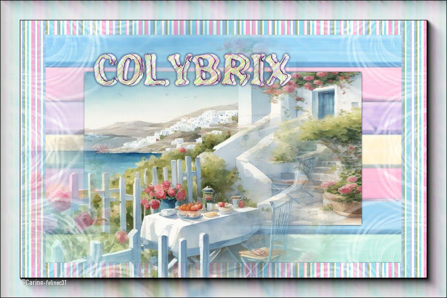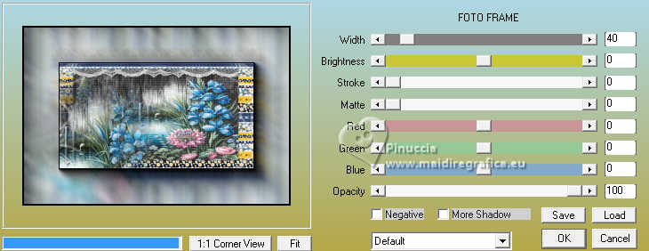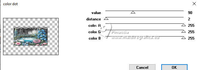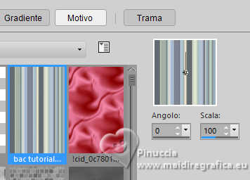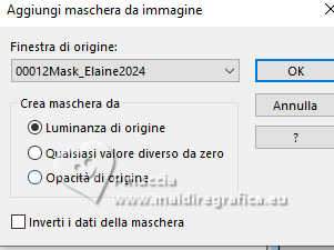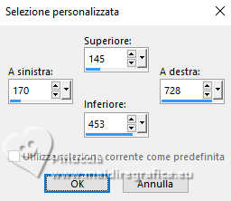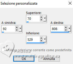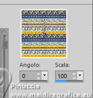 qui puoi trovare qualche risposta ai tuoi dubbi. Se l'argomento che ti interessa non è presente, ti prego di segnalarmelo. Questo tutorial è stato realizzato con PSP2020 e tradotto con PSPX9 e PSP2020, ma può essere eseguito anche con le altre versioni di PSP. Dalla versione X4, il comando Immagine>Rifletti è stato sostituito con Immagine>Capovolgi in orizzontale, e il comando Immagine>Capovolgi con Immagine>Capovolgi in verticale. Nelle versioni X5 e X6, le funzioni sono state migliorate rendendo disponibile il menu Oggetti. Con la nuova versione X7, sono tornati Rifletti>Capovolgi, ma con nuove varianti. Vedi la scheda sull'argomento qui ![]() Occorrente: Un'immagine Un misted 2 Motivi (ne ho allegati alcuni al materiale, ma sei libero di utilizzare quelli che preferisci). Il resto del materiale ![]() (in questa pagina trovi i links ai siti dei creatori di tubes) Filtri: se hai problemi con i filtri, consulta la mia sezione filtri qui Filters Unlimited 2.0 qui Penta.com - Color Dot qui AAA Frames - Foto Frame qui I filtri Penta.com si possono usare da soli o importati in Filters Unlimited (come fare vedi qui) Se un filtro fornito appare con questa icona ![]() non esitare a cambiare modalità di miscelatura e opacità secondo i colori utilizzati. ![]() Apri la maschera e i motivi scelti in PSP e minimizzali con il resto del materiale. 1. Apri una nuova immagine trasparente 900 x 600 pixels. 2. Passa il colore di primo piano a Motivi e seleziona uno dei motivi scelti, con i seguenti settaggi: ![]() 3. Passa il colore di sfondo a Motivi e seleziona il secondo motivo scelto, con gli stessi settaggi. ![]() 3. Riempi l'immagine trasparente con il motivo di primo piano.4. Livelli>Nuovo livello raster. 5. Attiva lo strumento Selezione ![]() (non importa il tipo di selezione impostato, perché con la selezione personalizzata si ottiene sempre un rettangolo) clicca sull'icona Selezione personalizzata ![]() e imposta i seguenti settaggi. ![]() 6. Riempi la selezione con il motivo di sfondo.7. Selezione>Deseleziona. 8. Livelli>Nuovo livello raster. Selezione personalizzata ![]() ![]() 9. Apri l'immagine in jpg e vai a Modifica>Copia. Torna al tuo lavoro e vai a Modifica>Incolla nella selezione. Selezione>Deseleziona. 10. Effetti>Effetti 3D>Sfalsa ombra, colore nero. ![]() 11. Effetti>Plugins>Penta.com - Color Dot, con i settaggi standard. ![]() 12. Apri il tuo misted e vai a Modifica>Copia. Torna al tuo lavoro e vai a Modifica>Incolla come nuovo livello. Spostalo in basso a sinistra.13. Imposta il colore di primo piano con il colore bianco #ffffff. Livelli>Nuovo livello raster. Riempi il livello con il colore bianco.14. Livelli>Nuovo livello maschera>Da immagine. Apri il menu sotto la finestra di origine e vedrai la lista dei files aperti. Seleziona la maschera 00012Mask_Elaine2024 ![]() Effetti>Effetti di bordo>Aumenta. Livelli>Unisci>Unisci gruppo. 15. Livelli>Unisci>Unisci tutto. 16. Effetti>Plugins>AAA Frames - Foto Frame. ![]() 17. Apri colybrix.png ![]() Modifica>Copia. Torna al tuo lavoro e vai a Modifica>Incolla come nuovo livello. Posiziona il testo a tuo piacimento.18. Firma il tuo lavoro e salva in formato jpg. Per i tubes di questi esempi grazie Mentali ![]() Kamil ![]() ![]() Le vostre versioni. Grazie ![]() Felinec31 ![]() Puoi scrivermi se hai problemi o dubbi, o trovi un link che non funziona, o soltanto per un saluto. |