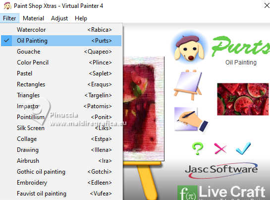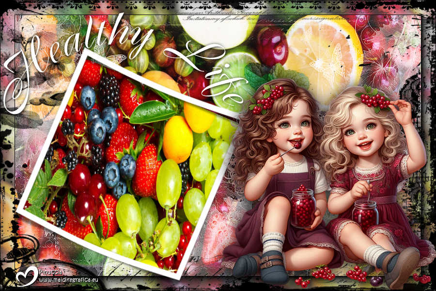 qui puoi trovare qualche risposta ai tuoi dubbi. Se l'argomento che ti interessa non è presente, ti prego di segnalarmelo. Questo tutorial è stato realizzato con PSP2020 e tradotto con PSPX9 e PSP2020, ma può essere eseguito anche con le altre versioni di PSP. Dalla versione X4, il comando Immagine>Rifletti è stato sostituito con Immagine>Capovolgi in orizzontale, e il comando Immagine>Capovolgi con Immagine>Capovolgi in verticale. Nelle versioni X5 e X6, le funzioni sono state migliorate rendendo disponibile il menu Oggetti. Con la nuova versione X7, sono tornati Rifletti>Capovolgi, ma con nuove varianti. Vedi la scheda sull'argomento qui ![]() Occorrente: Due immagini di frutta e un tube Il resto del materiale ![]() Per il tube del mio esempio grazie Elaine (in questa pagina trovi i links ai siti dei creatori di tubes) Filtri: se hai problemi con i filtri, consulta la mia sezione filtri qui Virtual Painter - Virtual Painter 4 qui AAA Frames - Foto Frame qui ![]() non esitare a cambiare modalità di miscelatura e opacità secondo i colori utilizzati. ![]() Apri la maschera in PSP e minimizzala con il resto del materiale. 1. Apri una nuova immagine trasparente 900 x 600 pixels. 2. Selezione>Seleziona tutto. 3. Apri la tua immagine di frutta e vai a Modifica>Copia. Torna al tuo lavoro e vai a Modifica>Incolla nella selezione. Mantieni selezionato. 4. Livelli>Nuovo livello raster. Selezione>Modifica>Contrai - 50 pixels. 5. Modifica>Incolla nella selezione (la tua immagine è sempre in memoria). Selezione>Deseleziona. 6. Effetti>Plugins>Virtual Painter - Virtual Painter 4. ![]() Ripeti l'Effetto una seconda volta. 7. Cambia la modalità di miscelatura di questo livello in Luce diffusa, o secondo la tua immagine. 8. Imposta il colore di primo piano con il colore bianco. Livelli>Nuovo livello raster. Riempi il livello con il colore bianco.9. Livelli>Nuovo livello maschera>Da immagine. Apri il menu sotto la finestra di origine e vedrai la lista dei files aperti. Seleziona la maschera 00019Mask_Elaine2024.jpg ![]() Effetti>Effetti di bordo>Aumenta. Livelli>Unisci>Unisci gruppo. 10. Abbassa l'opacità di questo livello tra il 60% e l'80%, secondo la tua immagine. Livelli>Unisci>Unisci tutto. 11. Effetti>Plugins>AAA Frames - Foto Frame. ![]() 12. Livelli>Nuovo livello raster. Selezione>Seleziona tutto. 13. Apri mzimm_cheerfulness_pb2R.png ![]() Modifica>Copia. Torna al tuo lavoro e vai a Modifica>Incolla nella selezione. 14. Selezione>Deseleziona. 15. Apri la cornice Frame ![]() Modifica>Copia. Torna al tuo lavoro e vai a Modifica>Incolla come nuovo livello. Sposta la cornice in basso a sinistra.16. Attiva lo strumento Bacchetta magica ![]() e clicca nella cornice per selezionarla. ![]() Selezione>Modifica>Espandi - 8 pixels. 17. Mantieni selezionato. Livelli>Nuovo livello raster. Apri la tua seconda immagine (o la stessa se preferisci) e vai a Modifica>Copia. Torna al tuo lavoro e vai a Modifica>Incolla nella selezione. 18. Selezione>Deseleziona. Livelli>Disponi>Sposta giù. Attiva il livello superiore. Livelli>Unisci>Unisci giù. 19. Apri il tube principale e vai a Modifica>Copia. Torna al tuo lavoro e vai a Modifica>Incolla come nuovo livello. Sposta il tube a destra.20. Apri il testo Frase healthy Life ![]() Modifica>Copia. Torna al tuo lavoro e vai a Modifica>Incolla come nuovo livello. (Nota dell'autore: GENTILMENTE NON MODIFICARE IL MIO LAVORO, NON CREARE UN'ALTRA FRASE O UTILIZZARE UN ALTRO FONT - RISPETTA IL MIO LAVORO) Sposta il testo in alto a sinistra.21. Immagine>Aggiungi bordatura, 5 pixels, simmetriche, colore nero. Firma il tuo lavoro e salva in formato jpg. Per il tube di questo esempio grazie Gerda ![]() ![]() Le vostre versioni. Grazie![]() Marygraphics ![]() Tosca dei gatti ![]() Rolande ![]() Puoi scrivermi se hai problemi o dubbi, o trovi un link che non funziona, o soltanto per un saluto. |