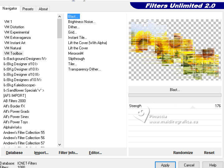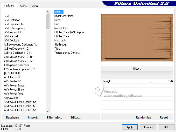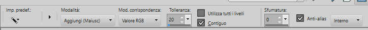 qui puoi trovare qualche risposta ai tuoi dubbi. Se l'argomento che ti interessa non è presente, ti prego di segnalarmelo. Questo tutorial è stato realizzato con PSP2020 e tradotto con PSPX9 e PSP2020, ma può essere eseguito anche con le altre versioni di PSP. Dalla versione X4, il comando Immagine>Rifletti è stato sostituito con Immagine>Capovolgi in orizzontale, e il comando Immagine>Capovolgi con Immagine>Capovolgi in verticale. Nelle versioni X5 e X6, le funzioni sono state migliorate rendendo disponibile il menu Oggetti. Con la nuova versione X7, sono tornati Rifletti>Capovolgi, ma con nuove varianti. Vedi la scheda sull'argomento qui ![]() Occorrente: 1 tube a scelta. 1 Immagine a scelta Il resto del materiale ![]() (in questa pagina trovi i links ai siti dei creatori di tubes) Filtri: se hai problemi con i filtri, consulta la mia sezione filtri qui Filters Unlimited 2.0 qui &<Bkg Kaleidoscope> - @Mirrored & Scaled (da importare in Unlimited) qui VM Toolbox - qui AAA Frames - Foto Frame qui I filtri VM Toolbox si possono usare da soli o importati in Filters Unlimited (come fare vedi qui) Se un filtro fornito appare con questa icona ![]() non esitare a cambiare modalità di miscelatura e opacità secondo i colori utilizzati. ![]() Apri la maschera in PSP e minimizzala con il resto del materiale. 1. Apri una nuova immagine trasparente 900 x 600 pixels. 2. Scegli due colori dalla tua immagine o dal tuo tube. Per l'esempio ho scelto: colore di primo piano con #bd8b62 colore di sfondo #edae03 ![]() Riempi l'immagine trasparente con il tuo colore di primo piano #bd8b62.3. Effetti>Plugins>AAA Frames - Foto Frame, con i settaggi standard. ![]() 4. Effetti>Plugins>Filters Unlimited 2.0 - VM Toolbox - Blast, con i settaggi standard. ![]() 5. Apri SLAT TUTORIAL 51 ![]() Modifica>Copia. Torna al tuo lavoro e vai a Modifica>Incolla come nuovo livello. 6. Attiva lo strumento Bacchetta magica , modalità Aggiungiimposta la tolleranza quanto necessario - tra 10 e 20 a seconda della striscia da selezionare. ![]() e clicca in ciascuna parte nera per selezionarla. Non sarà facile ottenere il migliore risultato; ingrandisci bene l'immagine e seleziona prima le parti piccole, poi le parti più grandi, in ogni caso non si può evitare che alcune parti si "uniscano". ![]() per velocizzare l'operazione, ho creato una selezione che trovi nel materiale. Selezione>Carica/Salva selezione>Carica selezione da disco. Cerca e carica la selezione ![]() 7. Livelli>Nuovo livello raster. Attiva la tua immagine e vai a Modifica>Copia. Torna al tuo lavoro e vai a Modifica>Incolla nella selezione. ![]() Selezione>Deseleziona. 8. Di nuovo Effetti>Plugins>VM Toolbox - Blast, con i settaggi standard. ![]() 9. Livelli>Nuovo livello raster. Riempi il livello con il colore di sfondo #edae03.10. Livelli>Nuovo livello maschera>Da immagine. Apri il menu sotto la finestra di origine e vedrai la lista dei files aperti. Seleziona la maschera masque Violine ![]() Effetti>Effetti di bordo>Aumenta di più. Livelli>Unisci>Unisci gruppo. 11. Apri Decoração tutorial 51 ![]() Modifica>Copia. Torna al tuo lavoro e vai a Modifica>Incolla come nuovo livello. E' al suo posto ![]() 13. Apri il tuo tube e vai a Modifica>Copia. Torna al tuo lavoro e vai a Modifica>Incolla come nuovo livello. Sposta il tube a sinistra.Effetti>Effetti 3D>Sfalsa ombra, a scelta. 13. Apri il wordart Word Art-by Elaine 20250 ![]() Modifica>Copia. Torna al tuo lavoro e vai a Modifica>Incolla come nuovo livello. Posiziona il testo come preferisci.Messaggio dell'autrice: VI CHIEDO GENTILMENTE DI NON MODIFICARE IL MIO LAVORO, DI NON USARE UN'ALTRA FRASE O UN'ALTRA PAROLA, DI NON RIDIMENSIONARE. RISPETTA IL MIO TEMPO DEDICATO ALLA CREAZIONE. QUESTO WORDART FA PARTE DEL TUTORIAL.) 14. Livelli>Unisci>Unisci tutto. Modifica>Copia Immagine>Aggiungi bordatura, 2 pixels, simmetriche, colore nero. 15. Selezione>Seleziona tutto. Immagine>Aggiungi bordatura, 40 pixels, simmetriche, con un colore qualsiasi. Selezione>Inverti. Livelli>Nuovo livello raster. Modifica>Incolla nella selezione 16. Effetti>Plugins>Filters Unlimited 2.0 - &<Bkg Kaleidoscope> - @Mirrored & Scaled ![]() 17. Immagine>Aggiungi bordatura, 2 pixels, simmetriche, colore nero. Selezione>Deseleziona. 18. Firma il tuo lavoro e salva in formato jpg. Per il tube di questo esempio grazie Elaine ![]() ![]() Le vostre versioni. Grazie ![]() Tosca dei gatti ![]() Marygraphics ![]() Baby ![]() Baby ![]() Puoi scrivermi se hai problemi o dubbi, o trovi un link che non funziona, o soltanto per un saluto. |