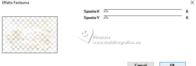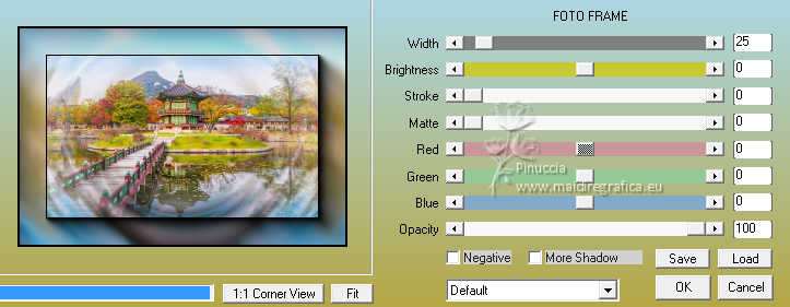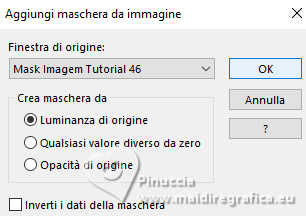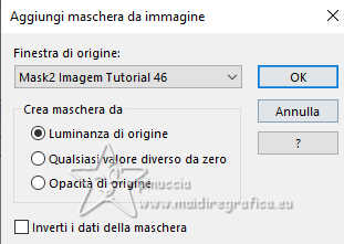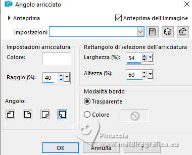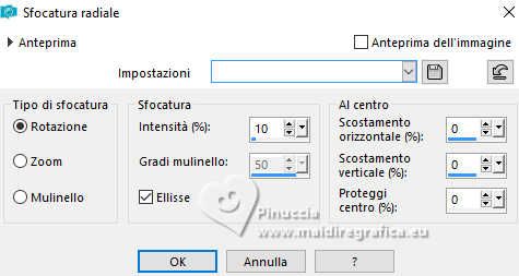 qui puoi trovare qualche risposta ai tuoi dubbi. Se l'argomento che ti interessa non è presente, ti prego di segnalarmelo. Questo tutorial è stato realizzato con PSP2020 e tradotto con PSPX9 e PSP2020, ma può essere eseguito anche con le altre versioni di PSP. Dalla versione X4, il comando Immagine>Rifletti è stato sostituito con Immagine>Capovolgi in orizzontale, e il comando Immagine>Capovolgi con Immagine>Capovolgi in verticale. Nelle versioni X5 e X6, le funzioni sono state migliorate rendendo disponibile il menu Oggetti. Con la nuova versione X7, sono tornati Rifletti>Capovolgi, ma con nuove varianti. Vedi la scheda sull'argomento qui ![]() Occorrente: 1 immagine 1 misted 1 Tube Il resto del materiale ![]() Per i tubes delle mie versioni grazie Silvie e Tina. (in questa pagina trovi i links ai siti dei creatori di tubes) Filtri: se hai problemi con i filtri, consulta la mia sezione filtri qui Filters Unlimited 2.0 qui AAA Frames - Foto Frame qui It@lian Editors Effect - Effetto Fantasma qui I filtri It@lian Editors si possono usare da soli o importati in Filters Unlimited (come fare vedi qui) Se un filtro fornito appare con questa icona ![]() non esitare a cambiare modalità di miscelatura e opacità secondo i colori utilizzati. ![]() Apri le maschere in PSP e minimizzale con il resto del materiale. 1. Apri una nuova immagine trasparente 900 x 600 pixels. 2. Selezione>Seleziona tutto. Apri la tua immagine di sfondo e vai a Modifica>Copia. Torna al tuo lavoro e vai a Modifica>Incolla nella selezione. Selezione>Deseleziona. 3. Regola>Sfocatura>Sfocatura radiale. ![]() 4. Imposta il colore di primo piano con il colore bianco #ffffff. Livelli>Nuovo livello raster. Riempi il livello con il colore bianco.5. Livelli>Nuovo livello maschera>da immagine. Apri il menu sotto la finestra d'origine e vedrai la lista dei files aperti. Seleziona la maschera Mask Imagem Tutorial 46 ![]() Effetti>Effetti di bordo>Aumenta. Livelli>Unisci>Unisci gruppo. 6. Abbassa l'opacità di questo livello al 50%, o secondo la tua immagine di sfondo. 7. Effetti>Plugins>It@lian Editors Editors Effect - Effetto Fantasma ![]() 8. Effetti>Effetti di immagine>Angolo arricciato. ![]() 9. Livelli>Unisci>Unisci tutto. 10. Effetti>Plugins>Filters Unlimited 2.0 - Tile & Mirror - Distortion Mirror Horizontal. ![]() 11. Apri il tuo misted e vai a Modifica>Copia. Torna al tuo lavoro e vai a Modifica>Incolla come nuovo livello. Se necessario, ridimensiona. Posiziona il tube al centro.12. Livelli>Unisci>Unisci tutto. 13. Effetti>Plugins>AAA Frames - Foto Frame. ![]() 14. Livelli>Nuovo livello raster. Riempi il livello con il colore bianco.15. Livelli>Nuovo livello maschera>Da immagine. Apri il menu sotto la finestra di origine e seleziona la maschera Mask2 Imagem Tutorial 46 ![]() Effetti>Effetti di bordo>Aumenta. Livelli>Unisci>Unisci gruppo. 16. Effetti>Effetti 3D>Sfalsa ombra. ![]() 17. Apri KOREA-TUTORIAL 46 ![]() Modifica>Copia. Torna al tuo lavoro e vai a Modifica>Incolla come nuovo livello. Sposta il tube in basso a sinistra.18. Apri il tuo tube e vai a Modifica>Copia. Torna al tuo lavoro e vai a Modifica>Incolla come nuovo livello. Spostalo a destra.Effetti>Effetti 3D>Sfalsa ombra, a scelta. 19. Immagine>Aggiungi bordatura, 2 pixels, simmetriche, colore nero. Immagine>Aggiungi bordatura, 2 pixels, simmetriche, colore bianco. Immagine>Aggiungi bordatura, 2 pixels, simmetriche, colore nero. Immagine>Aggiungi bordatura, 2 pixels, simmetriche, colore bianco. Immagine>Aggiungi bordatura, 10 pixels, simmetriche, colore nero. 20. Firma il tuo lavoro e salva in formato jpg. ![]() ![]() Le vostre versioni. Grazie![]() Puoi scrivermi se hai problemi o dubbi, o trovi un link che non funziona, o soltanto per un saluto. |
