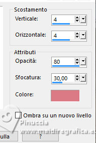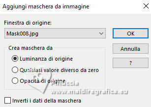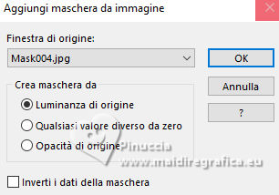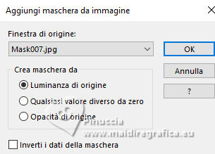 qui puoi trovare qualche risposta ai tuoi dubbi. Se l'argomento che ti interessa non è presente, ti prego di segnalarmelo. Questo tutorial è stato realizzato con PSP2020 e tradotto con PSPX9 e PSP2020, ma può essere eseguito anche con le altre versioni di PSP. Dalla versione X4, il comando Immagine>Rifletti è stato sostituito con Immagine>Capovolgi in orizzontale, e il comando Immagine>Capovolgi con Immagine>Capovolgi in verticale. Nelle versioni X5 e X6, le funzioni sono state migliorate rendendo disponibile il menu Oggetti. Con la nuova versione X7, sono tornati Rifletti>Capovolgi, ma con nuove varianti. Vedi la scheda sull'argomento qui ![]() Traduzione inglese quiOccorrente: 1 immagine di sfondo 1 tube principale. 1 tube accessorio Il resto del materiale ![]() (in questa pagina trovi i links ai siti dei creatori di tubes) Filtri: se hai problemi con i filtri, consulta la mia sezione filtri qui Filters Unlimited 2.0 qui Alf's Border FX - Border Fade I qui Filtres Simple peuvent être utilisés seuls ou importés dans Filters Unlimited. voir comment le faire ici). Si un filtre est fourni avec cette icône, I filtri Alf's Border FX si possono usare da soli o importati in Filters Unlimited (come fare vedi qui) Se un filtro fornito appare con questa icona ![]() non esitare a cambiare modalità di miscelatura e opacità secondo i colori utilizzati. ![]() Apri le maschere in PSP e minimizzale con il resto del materiale. 1. Apri una nuova immagine trasparente 900 x 600 pixels. 2. Imposta il colore di primo piano con il colore bianco. Riempi l'immagine trasparente con il colore bianco.3. Livelli>Nuovo livello raster. Selezione>Seleziona tutto. Apri la tua immagine di sfondo e vai a Modifica>Copia. Torna al tuo lavoro e vai a Modifica>Incolla nella selezione. Selezione>Deseleziona. 4. Livelli>Nuovo livello maschera>Da immagine. Apri il menu sotto la finestra di origine e vedrai la lista dei files aperti. Seleziona la maschera Mask004 ![]() Livelli>Unisci>Unisci gruppo. 5. Livelli>Nuovo livello raster. Imposta il colore di sfondo con un colore del tuo tube o della tua immagine. Riempi il livello con il colore di sfondo.6. Livelli>Nuovo livello maschera>Da immagine. Apri il menu sotto la finestra di origine e seleziona la maschera Mask008 ![]() Livelli>Unisci>Unisci gruppo. 7. Effetti>Effetti 3D>Sfalsa ombra, colore bianco. ![]() 8. Livelli>Duplica. Livelli>Unisci>Unisci giù. 9. Livelli>Unisci>Unisci tutto. 10. Effetti>Plugins>Alf's Border FX - Border Fade I ![]() 11. Livelli>Nuovo livello raster. Riempi il livello con il colore bianco.12. Livelli>Nuovo livello maschera>Da immagine. Apri il menu sotto la finestra di origine e seleziona la maschera Mask007 ![]() Livelli>Unisci>Unisci gruppo. 13. Effetti>Effetti 3D>Sfalsa ombra, con i settaggi precedenti, ma con un colore più scuro. ![]() 14. Apri la frase La vie est belle ![]() Modifica>Copia. Torna al tuo lavoro e vai a Modifica>Incolla come nuovo livello. Posiziona il testo a tuo piacimento.15. Effetti>Effetti 3D>Sfalsa ombra, con i settaggi precedenti, colore bianco. ![]() 16. Apri il tuo tube e vai a Modifica>Copia. Torna al tuo lavoro e vai a Modifica>Incolla come nuovo livello. Immagine>Ridimensiona, se e quanto necessario, tutti i livelli non selezionato. Posiziona il tube al centro, o come preferisci.Effetti>Effetti 3D>Sfalsa ombra, a scelta. 17. Facoltativo, apri il tuo tube decorativo e vai a Modifica>Copia. Torna al tuo lavoro e vai a Modifica>Incolla come nuovo livello. Posiziona il tube a tuo piacimento.Effetti>Effetti 3D>Sfalsa ombra, a scelta. 18. Livelli>Unisci>Unisci tutto. 19. Immagine>Aggiungi bordatura, 1 pixel,simmetriche, colore nero. 20. Apri il testo Texto ![]() Modifica>Copia. Torna al tuo lavoro e vai a Modifica>Incolla come nuovo livello. Sposta il testo a destra.21. Firma il tuo lavoro e salva in formato jpg. ![]() ![]() Le vostre versioni. ![]() Puoi scrivermi se hai problemi o dubbi, o trovi un link che non funziona, o soltanto per un saluto. |