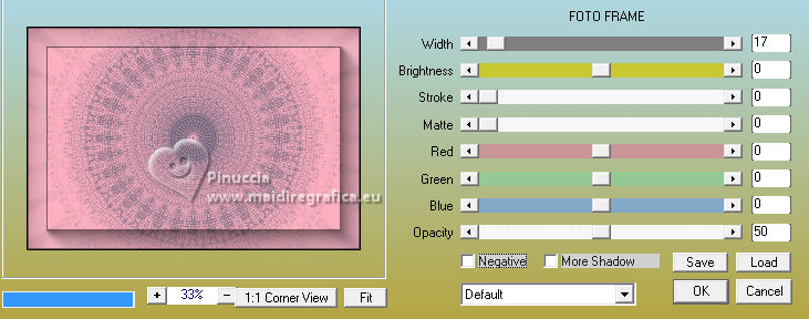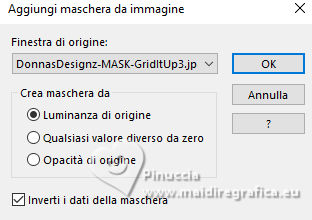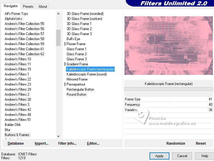 qui puoi trovare qualche risposta ai tuoi dubbi. Se l'argomento che ti interessa non è presente, ti prego di segnalarmelo. Questo tutorial è stato realizzato con PSP2020 e tradotto con PSPX9 e PSP2020, ma può essere eseguito anche con le altre versioni di PSP. Dalla versione X4, il comando Immagine>Rifletti è stato sostituito con Immagine>Capovolgi in orizzontale, e il comando Immagine>Capovolgi con Immagine>Capovolgi in verticale. Nelle versioni X5 e X6, le funzioni sono state migliorate rendendo disponibile il menu Oggetti. Con la nuova versione X7, sono tornati Rifletti>Capovolgi, ma con nuove varianti. Vedi la scheda sull'argomento qui ![]() Traduzione inglese quiOccorrente: a scelta: 1 immagine 1 tube principale. Il resto del materiale ![]() (in questa pagina trovi i links ai siti dei creatori di tubes) Filtri: se hai problemi con i filtri, consulta la mia sezione filtri qui Filters Unlimited 2.0 qui VM Distortion - Kaleidoscope qui DSB Flux - Blast qui AAA Frames - Foto Frame qui I filtri VM Distortion si possono usare da soli o importati in Filters Unlimited (come fare vedi qui) Se un filtro fornito appare con questa icona ![]() non esitare a cambiare modalità di miscelatura e opacità secondo i colori utilizzati. ![]() Apri le maschere in PSP e minimizzale con il resto del materiale. 1. Apri una nuova immagine trasparente 900 x 600 pixels. Scegli e imposta il colore di primo piano con un colore della tua immagine; per l'esempio #feb1c1. Scegli come colore di sfondo un colore più scuro della tua immagine; per l'esempio #676279 ![]() Riempi l'immagine trasparente con il colore di primo piano #feb1c1.2. Livelli>Nuovo livello raster. Riempi il livello con il colore di sfondo #6762793. Livelli>Nuovo livello maschera>Da immagine Apri il menu sotto la finestra di origine e vedrai la lista dei files aperti. Seleziona la maschera DonnasDesignz-MASK-GridItUp3.jpg ![]() Effetti>Effetti di bordo>Aumenta di più. Livelli>Unisci>Unisci gruppo. 4. Livelli>Unisci>Unisci giù. 5. Effetti>Plugins>Filters Unlimited 2.0 - Buttons & Frames - Kaleidoscope Frame rectangular, con i settaggi standard ![]() 6. Effetti>Plugins>Filters Unlimited 2.0 - VM Distortion - Kaleidoscope, con i settaggi standard. ![]() 7. Effetti>Plugins>AAA Frames - Foto Frame. ![]() 8. Livelli>Nuovo livello raster. Imposta il colore di primo piano con il colore bianco. ![]() Riempi il livello con il colore bianco9. Livelli>Nuovo livello maschera>Da immagine Apri il menu sotto la finestra di origine e seleziona la maschera MASK by ElaineA-Music ![]() Effetti>Effetti di bordo>Aumenta. Livelli>Unisci>Unisci gruppo. 10. Apri PNG Music Tutorial 10 ![]() Modifica>Copia. Torna al tuo lavoro e vai a Modifica>Incolla come nuovo livello. 11. Attiva lo strumento Bacchetta magica ![]() e clicca nell'immagine per selezionarla. ![]() 12. Selezione>Modifica>Espandi - 2 pixels. 13. Livelli>Nuovo livello raster. Apri la tua immagine e vai a Modifica>Copia. Torna al tuo lavoro e vai a Modifica>Incolla nella selezione. Selezione>Deseleziona. 14. Livelli>Disponi>Sposta giù. 15. Effetti>Plugins>DSB Flux - Blast ![]() 16. Attiva il livello superiore. Apri il tuo tube e vai a Modifica>Copia. Torna al tuo lavoro e vai a Modifica>Incolla come nuovo livello. Immagine>Ridimensiona, se necessario, tutti i livelli non selezionato. Posiziona correttamente il tube.Effetti>Effetti 3D>Sfalsa ombra, a scelta. 17. Apri il testo The phrase-Music is life ![]() Modifica>Copia. Torna al tuo lavoro e vai a Modifica>Incolla come nuovo livello. Posiziona correttamente il testo18. Immagine>Aggiungi bordatura, 1 pixel,simmetriche, colore nero. 19. Firma il tuo lavoro e salva in formato jpg. ![]() ![]() ![]() Le vostre versioni. ![]() Marygraphics ![]() Puoi scrivermi se hai problemi o dubbi, o trovi un link che non funziona, o soltanto per un saluto. |