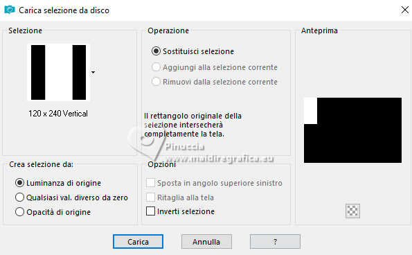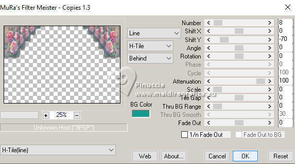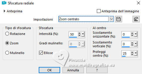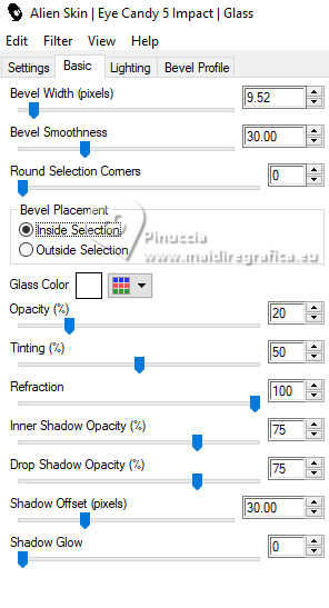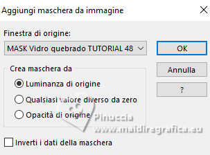 qui puoi trovare qualche risposta ai tuoi dubbi. Se l'argomento che ti interessa non è presente, ti prego di segnalarmelo. Questo tutorial è stato realizzato con PSP2020 e tradotto con PSPX9 e PSP2020, ma può essere eseguito anche con le altre versioni di PSP. Dalla versione X4, il comando Immagine>Rifletti è stato sostituito con Immagine>Capovolgi in orizzontale, e il comando Immagine>Capovolgi con Immagine>Capovolgi in verticale. Nelle versioni X5 e X6, le funzioni sono state migliorate rendendo disponibile il menu Oggetti. Con la nuova versione X7, sono tornati Rifletti>Capovolgi, ma con nuove varianti. Vedi la scheda sull'argomento qui ![]() Occorrente: 1 tube a scelta. Il resto del materiale ![]() (in questa pagina trovi i links ai siti dei creatori di tubes) Filtri: se hai problemi con i filtri, consulta la mia sezione filtri qui Filters Unlimited 2.0 qui AAA Frames - Foto Frame qui Alien Skin Eye Candy 5 Impact - Glass qui Mura's Meister - Copies qui ![]() non esitare a cambiare modalità di miscelatura e opacità secondo i colori utilizzati. ![]() La selezione 120x240 Vertical è standard in PSP. Se non la trovi nel tuo PSP, metti quella fornita nella cartella Selezioni. Apri la maschera in PSP e minimizzala con il resto del materiale. 1. Apri una nuova immagine trasparente 900 x 600 pixels. 2. Selezione>Seleziona tutto. Apri la tua immagine e vai a Modifica>Copia. Torna al tuo lavoro e vai a Modifica>Incolla nella selezione. Selezione>Deseleziona. 3. Regola>Sfocatura>Sfocatura radiale ![]() 4. Livelli>Nuovo livello raster. Imposta il colore di primo piano con un colore della tua immagine; per me #d57368. Riempi il livello con il colore di primo piano.5. Livelli>Nuovo livello maschera>Da immagine. Apri il menu sotto la finestra di origine e vedrai la lista dei files aperti. Seleziona la maschera MASK Vidro quebrado TUTORIAL 48 ![]() Effetti>Effetti di bordo>Aumenta di più - 2 volte. Livelli>Unisci>Unisci gruppo. 6. Effetti>Effetti 3D>Sfalsa ombra, colore nero. ![]() 7. Selezione>Carica/Salva selezione>Carica selezione da disco. Cerca e carica la selezione 120x240 vertical ![]() 8. Livelli>Nuovo livello raster. Modifica>Incolla nella selezione - la tua immagine è sempre in memoria. Selezione>Deseleziona. 9. Effetti>Plugins>Alien Skin Eye Candy 5 Impact - Glass, con i settaggi standard - 2 volte. sotto Basic, imposta Glass Color con il colore bianco. Inoltre, a volte i settaggi standard deformano l'immagine, adatta i settaggi per trovare il risultato migliore. Per il mio esempio. ![]() 10. Livelli>Duplica. Immagine>Rifletti>Rifletti orizzontalmente. Livelli>Unisci>Unisci giù. 11. Effetti>Plugins>Mura's Meister - Copies. ![]() 12. Apri il tuo misted e vai a Modifica>Copia. Torna al tuo lavoro e vai a Modifica>Incolla come nuovo livello. Immagine>Ridimensiona, quanto necessario, tutti i livelli non selezionato. Sposta l'immagine sul lato sinistro.13. Livelli>Unisci>Unisci tutto. 14. Effetti>Plugins>AAA Frames - Foto Frame. ![]() 15. Apri il tuo tube e vai a Modifica>Copia. Torna al tuo lavoro e vai a Modifica>Incolla come nuovo livello. Immagine>Ridimensiona, quanto necessario, tutti i livelli non selezionato. Sposta il tube a tuo piacimento.Effetti>Effetti 3D>Sfalsa ombra, a scelta. 16. Apri il testo Perfume ![]() Modifica>Copia. Torna al tuo lavoro e vai a Modifica>Incolla come nuovo livello. Sposta il testo come preferisci.17. Immagine>Aggiungi bordatura, 10 pixels, simmetriche, con un colore del tuo lavoro, per me #e07a6b. Firma il tuo lavoro e salva in formato jpg. Per il tube di questo esempio grazie Yvonne ![]() ![]() Puoi scrivermi se hai problemi o dubbi, o trovi un link che non funziona, o soltanto per un saluto. |