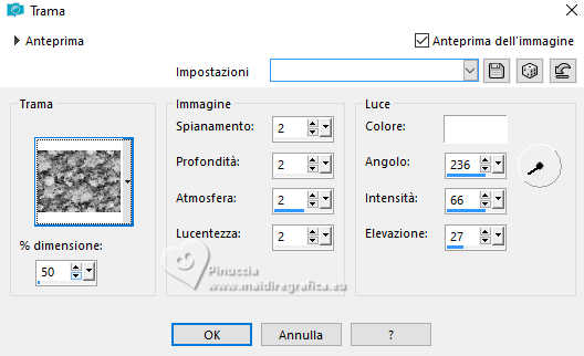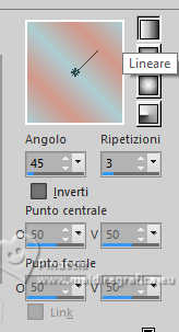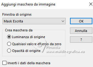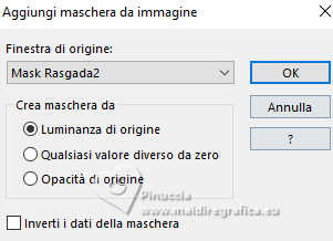 qui puoi trovare qualche risposta ai tuoi dubbi. Se l'argomento che ti interessa non è presente, ti prego di segnalarmelo. Questo tutorial è stato realizzato con PSP2020 e tradotto con PSPX9 e PSP2020, ma può essere eseguito anche con le altre versioni di PSP. Dalla versione X4, il comando Immagine>Rifletti è stato sostituito con Immagine>Capovolgi in orizzontale, e il comando Immagine>Capovolgi con Immagine>Capovolgi in verticale. Nelle versioni X5 e X6, le funzioni sono state migliorate rendendo disponibile il menu Oggetti. Con la nuova versione X7, sono tornati Rifletti>Capovolgi, ma con nuove varianti. Vedi la scheda sull'argomento qui ![]() Traduzione inglese quiOccorrente: a scelta: 1 tube principale. Vari elementi che si abbinano al tube, francobolli macchine fotografiche, 2 immagini che corrispondo al tema. Il resto del materiale ![]() (in questa pagina trovi i links ai siti dei creatori di tubes) Filtri: se hai problemi con i filtri, consulta la mia sezione filtri qui Xero - Porcelain qui ![]() non esitare a cambiare modalità di miscelatura e opacità secondo i colori utilizzati. Nelle ultime versioni di PSP non c'è il gradiente di primo piano/sfondo (Corel_06_029) Puoi usare i gradienti delle versioni precedenti. Trovi qui i gradienti Corel X. ![]() La trama Foglie autunnali o Corel_15_048 è standard in PSP. Se non la trovi nel tuo PSP, metti quella fornita nella cartella Trame. Apri le maschere in PSP e minimizzale con il resto del materiale. 1. Apri una nuova immagine trasparente 900 x 600 pixels. 2. Imposta il colore di primo piano con #adcdd1, e il colore di sfondo con #d39789. ![]() 3. Passa il colore di primo piano a Gradiente di primo piano/sfondo, stile Lineare. ![]() Riempi l'immagine trasparente con il gradiente.4. Effetti>Effetti di trama>Trama - seleziona la trama Foglie autunnali o Corel_15_048. ![]() 5. Passa il colore di primo piano a Colore. Livelli>Nuovo livello raster. Riempi il livello con il colore chiaro di primo piano #adcdd1.6. Livelli>Nuovo livello maschera>Da immagine. Apri il menu sotto la finestra di origine e vedrai la lista dei files aperti Seleziona la maschera Mask Rasgada, inverti i dati della maschera selezionato. ![]() Livelli>Unisci>Unisci gruppo. 7. Attiva lo strumento Bacchetta magica ![]() e clicca nella parte destra della maschera per selezionarla. 8. Livelli>Nuovo livello raster. Imposta il colore di primo piano con un colore grigio, o altro che si adatti al lavoro, per me #808080. Riempi il livello con il colore di primo piano.9. Livelli>Nuovo livello maschera>Da immagine. Apri il menu sotto la finestra di origine e seleziona la maschera Mask Escrita, inverti i dati della maschera non selezionato. ![]() Effetti>Effetti di bordo>Aumenta di più. Livelli>Unisci>Unisci gruppo. Selezione>Deseleziona. 10. Attiva nuovamente il livello Raster 2. Seleziona la parte sinistra con la bacchetta magica ![]() 11. Attiva il livello superiore. Apri la tua immagine e vai a Modifica>Copia. Torna al tuo lavoro e vai a Modifica>Incolla nella selezione. 12. Effetti>Plugins>Xero - Porcelain, con i settaggi standard. ![]() Selezione>Deseleziona. 13. Copia/Incolla come nuovo livello gli elementi e posizionali a tuo piacimento.Guarda il mio lavoro per orientarti e puoi usare altri elementi a tua scelta. Ridimansiona ogni elemento al 50%, per un look armonioso. 14. Su ogni elemento applica: Effetti>Plugins>Xero - Porcelain, con i settaggi standard. 15. Apri Abas Tutorial 59 ![]() Modifica>Copia. Torna al tuo lavoro e vai a Modifica>Incolla come nuovo livello. 16. Apri Frame Tutorial 59 ![]() Modifica>Copia. Torna al tuo lavoro e vai a Modifica>Incolla come nuovo livello. Clicca nella cornice con la bacchetta magica ![]() 17. Livelli>Nuovo livello raster. Apri un'altra immagine a tema e vai a Modifica>Copia. Torna al tuo lavoro e vai a Modifica>Incolla nella selezione. Selezione>Deseleziona. Effetti>Plugins>Xero - Porcelain, con i settaggi standard. 18. Livelli>Nuovo livello raster. Imposta il colore di primo piano con il colore bianco. Riempi il livello con il colore bianco.19. Livelli>Nuovo livello maschera>Da immagine. Apri il menu sotto la finestra di origine e seleziona la maschera Mask Rasgada2, inverti i dati della maschera non selezionato. ![]() Effetti>Effetti di bordo>Aumenta di più. Livelli>Unisci>Unisci gruppo. 20. Effetti>Effetti 3D>Sfalsa ombra ![]() 21. Apri il tuo tube e vai a Modifica>Copia. Torna al tuo lavoro e vai a Modifica>Incolla come nuovo livello. Immagine>Ridimensiona, se e quanto necessario, tutti i livelli non selezionato. Effetti>Effetti 3D>Sfalsa ombra, a scelta. 22. Immagine>Aggiungi bordatura, 2 pixels, simmetriche, colore #d39789. Immagine>Aggiungi bordatura, 2 pixels, simmetriche, colore #adcdd1. Immagine>Aggiungi bordatura, 2 pixels, simmetriche, colore #d39789. 23. Firma il tuo lavoro e salva in formato jpg. Version avec images de Pinterest ![]() ![]() Puoi scrivermi se hai problemi o dubbi, o trovi un link che non funziona, o soltanto per un saluto. |