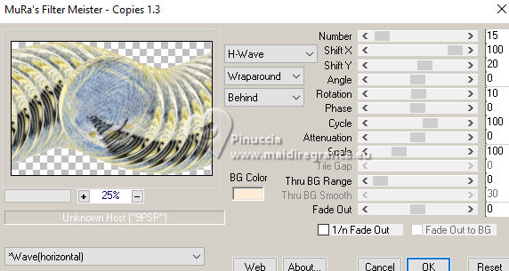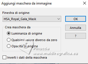 qui puoi trovare qualche risposta ai tuoi dubbi. Se l'argomento che ti interessa non è presente, ti prego di segnalarmelo. Questo tutorial è stato realizzato con PSP2020 e tradotto con PSPX9 e PSP2020, ma può essere eseguito anche con le altre versioni di PSP. Dalla versione X4, il comando Immagine>Rifletti è stato sostituito con Immagine>Capovolgi in orizzontale, e il comando Immagine>Capovolgi con Immagine>Capovolgi in verticale. Nelle versioni X5 e X6, le funzioni sono state migliorate rendendo disponibile il menu Oggetti. Con la nuova versione X7, sono tornati Rifletti>Capovolgi, ma con nuove varianti. Vedi la scheda sull'argomento qui ![]() Occorrente: 2 immagini di sfondo 1 misted di paesaggio 1 decoro (facoltativo) Il resto del materiale ![]() (in questa pagina trovi i links ai siti dei creatori di tubes) Filtri: se hai problemi con i filtri, consulta la mia sezione filtri qui Mura's Meister - Pole Transform qui Mura's Meister - Copies qui ![]() non esitare a cambiare modalità di miscelatura e opacità secondo i colori utilizzati. ![]() Apri la maschera in PSP e minimizzala con il resto del materiale. 1. Apri una nuova immagine trasparente 900 x 600 pixels. Selezione>Seleziona tutto. 2. Apri una delle immagini di sfondo e vai a Modifica>Copia. Torna al tuo lavoro e vai a Modifica>Incolla nella selezione. Selezione>Deseleziona. 3. Livelli>Nuovo livello raster. Selezione>Seleziona tutto. Apri la seconda immagine di sfondo e vai a Modifica>Copia. Torna al tuo lavoro e vai a Modifica>Incolla nella selezione. Selezione>Deseleziona. 4. Livelli>Nuovo livello maschera>Da immagine. Apri il menu sotto la finestra di origine e vedrai la lista dei files aperti. Seleziona la maschera HSA_Royal_Gala_Mask ![]() Effetti>Effetti di bordo>Aumenta - 2 volte. Livelli>Unisci>Unisci gruppo. 5. Apri Circulo Sweet Dreams ![]() Modifica>Copia. Torna al tuo lavoro e vai a Modifica>Incolla come nuovo livello. 6. Effetti>Plugins>Mura's Meister - Pole Transform. ![]() 7. Abbassa l'opacità di questo livello a 60/70%. 8. Apri il testo Frase Sweet Dreams ![]() Modifica>Copia. Torna al tuo lavoro e vai a Modifica>Incolla come nuovo livello. 9. Attiva lo strumento Puntatore ![]() Posizione X: 313,00 e Posizione Y: 291,00. ![]() 10. Effetti>Effetti 3D>Sfalsa ombra. ![]() 11. Livelli>Unisci>Unisci visibile. 12. Effetti>Effetti geometrici>Cerchio. ![]() 14. Livelli>Nuovo livello raster. Selezione>Seleziona tutto. 15. Attiva nuovamente una delle due immagini di sfondo e vai a Modifica>Copia. Torna al tuo lavoro e vai a Modifica>Incolla nella selezione. Selezione>Deseleziona. Livelli>Disponi>Sposta giù. 16. Attiva il livello superiore. Immagine>Ridimensiona, all'80%, tutti i livelli non selezionato. 17. Effetti>Plugins>Mura's Meister - Copies. ![]() 18. Apri il misted e vai a Modifica>Copia. Torna al tuo lavoro e vai a Modifica>Incolla come nuovo livello. Ridimensiona, se necessario, e posiziona il tube al centro.19. Imposta il colore di primo piano con il colore bianco. Livelli>Nuovo livello raster. Riempi il livello con il colore bianco.20. Livelli>Nuovo livello maschera>Da immagine. Apri il menu sotto la finestra di origine e seleziona nuovamente la maschera HSA_Royal_Gala_Mask ![]() Effetti>Effetti di bordo>Aumenta. Livelli>Unisci>Unisci gruppo. 21. Abbassa l'opacità di questo livello a 60/70%. 22. Apri il tube principale e vai a Modifica>Copia. Torna al tuo lavoro e vai a Modifica>Incolla come nuovo livello. Adatta il tube al tuo lavoro. 23. Immagine>Aggiungi bordatura, 1 pixel, simmetriche, colore nero. 24. Apri il testo Sweet Dreams ![]() Modifica>Copia. Torna al tuo lavoro e vai a Modifica>Incolla come nuovo livello. Posiziona il testo a tuo piacimento.(Nota dell'autrice: non modificare il mio lavoro. Non aggiungere un'altra frase che il tutorial non richiede. RISPETTA il tempo che ho impiegato a creare questo tutorial.) 25. Firma il tuo lavoro e salva in formato jpg. Per i tubes di questo esempio grazie Elfairy ![]() ![]() Le vostre versioni. Grazie![]() Puoi scrivermi se hai problemi o dubbi, o trovi un link che non funziona, o soltanto per un saluto. |