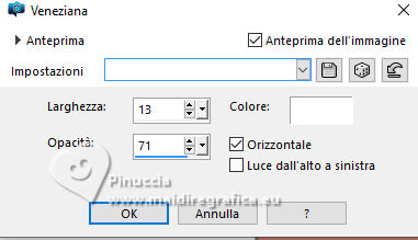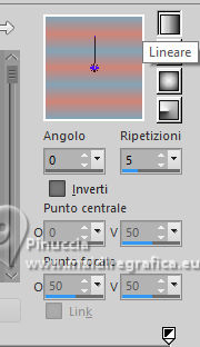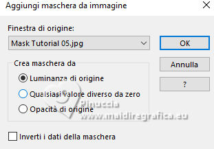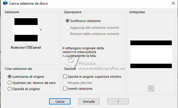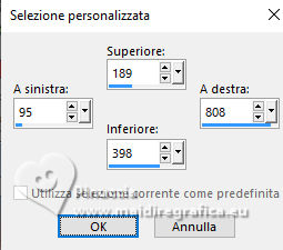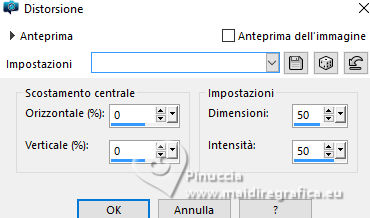 qui puoi trovare qualche risposta ai tuoi dubbi. Se l'argomento che ti interessa non è presente, ti prego di segnalarmelo. Questo tutorial è stato realizzato con PSP2020 e tradotto con PSPX9 e PSP2020, ma può essere eseguito anche con le altre versioni di PSP. Dalla versione X4, il comando Immagine>Rifletti è stato sostituito con Immagine>Capovolgi in orizzontale, e il comando Immagine>Capovolgi con Immagine>Capovolgi in verticale. Nelle versioni X5 e X6, le funzioni sono state migliorate rendendo disponibile il menu Oggetti. Con la nuova versione X7, sono tornati Rifletti>Capovolgi, ma con nuove varianti. Vedi la scheda sull'argomento qui ![]() Traduzione inglese quiOccorrente: 1 misted 1 tube principale. Il resto del materiale ![]() (in questa pagina trovi i links ai siti dei creatori di tubes) Filtri: se hai problemi con i filtri, consulta la mia sezione filtri qui Mura's Meister - Perspective Tiling, Pole Trasform qui ![]() non esitare a cambiare modalità di miscelatura e opacità secondo i colori utilizzati. Nelle ultime versioni di PSP non c'è il gradiente di primo piano/sfondo (Corel_06_029) Puoi usare i gradienti delle versioni precedenti. Trovi qui i gradienti Corel X. ![]() Metti la selezione nella cartella Selezioni. Apri la maschera in PSP e minimizzala con il resto del materiale. 1. Apri una nuova immagine trasparente 900 x 600 pixels. 2. Scegli due colori dalla tua immagine. Io ho usato: colore di primo piano #84a3b5, colore di sfondo #d08477. ![]() 3. Passa il colore di primo piano a Gradiente di primo piano/sfondo, stile Lineare. ![]() Riempi l'immagine trasparente con il gradiente.4. Effetti>Effetti di distorsione>Distorsione. ![]() 5. Effetti>Effetti di bordo>Aumenta di più - 2 volte. 6. Livelli>Nuovo livello raster. Selezione>Carica/Salva selezione>Carica selezione da disco. Cerca e carica la selezione #selectionT05 ![]() 7. Riempi la selezione con uno dei tuoi colori,io ho usato il colore di sfondo #d08477. 8. Selezione>Deseleziona. 9. Effetti>Effetti di trama>Veneziana. ![]() 10. Effetti>Effetti di distorsione>Distorsione, con i settaggi precedenti. ![]() 11. Attiva lo strumento Selezione ![]() (non importa il tipo di selezione impostato, perchè con la selezione personalizzata si ottiene sempre un rettangolo) clicca sull'icona Selezione personalizzata ![]() e imposta i seguenti settaggi. ![]() Premi sulla tastiera il tasto CANC ![]() Selezione>Deseleziona. 12. Effetti>Effetti 3D>Sfalsa ombra. ![]() 13. Immagine>Ridimensiona, al 75%, tutti i livelli non selezionato. 14. Effetti>Plugins>Mura's Meister - Perspective Tiling. ![]() 15. Effetti>Plugins>Mura's Meister - Pole Transform. ![]() 16. Imposta il colore di primo piano con il colore bianco. Livelli>Nuovo livello raster. Riempi il livello con il colore bianco.Livelli>Nuovo livello maschera>Da immagine. Apri il menu sotto la finestra di origine e vedrai la lista dei files aperti. Seleziona la maschera Mask Tutorial 05 ![]() Effetti>Effetti di bordo>Aumenta di più. Livelli>Unisci>Unisci gruppo. 17. Apri il tuo misted e vai a Modifica>Copia. Torna al tuo lavoro e vai a Modifica>Incolla come nuovo livello. Ridimensiona, se necessario. 18. Strumento Puntatore come nell'esempio![]() 19. Apri Traçado coraçäo ![]() Modifica>Copia. Torna al tuo lavoro e vai a Modifica>Incolla come nuovo livello. Spostalo a destra.20. Apri il tuo tube e vai Modifica>Copia. Torna al tuo lavoro e vai a Modifica>Incolla come nuovo livello. Sposta il tube a destra.21. Immagine>Aggiungi bordatura, 1 pixel, simmetriche, colore scuro Immagine>Aggingi bordatura, 20 pixels, simmetriche, colore chiaro. Immagine>Aggiungi bordatura, 1 pixel, simmetriche, colore scuro. 22. Firma il tuo lavoro e salva in formato jpg. ![]() ![]() Le vostre versioni. ![]() Kika ![]() Puoi scrivermi se hai problemi o dubbi, o trovi un link che non funziona, o soltanto per un saluto. |