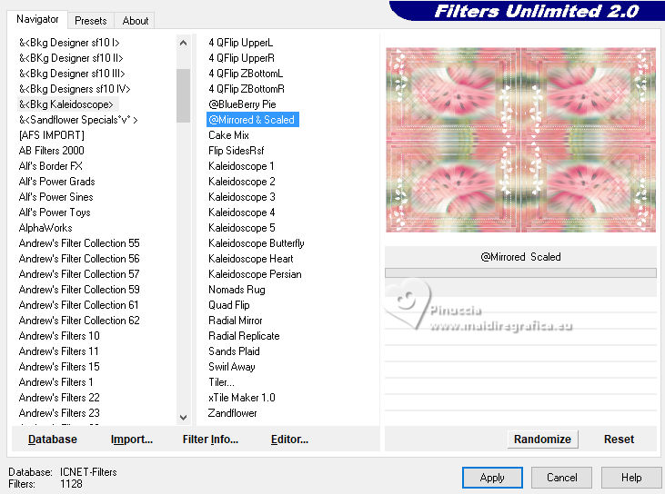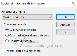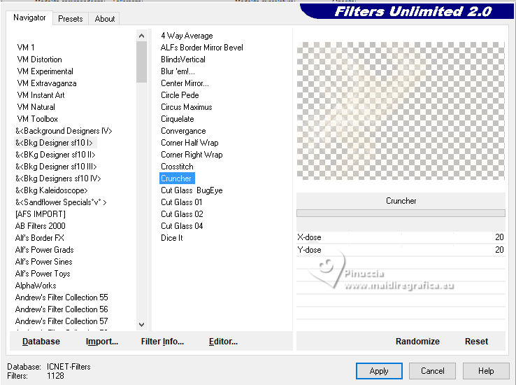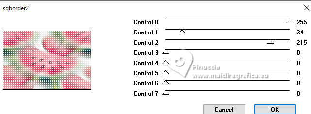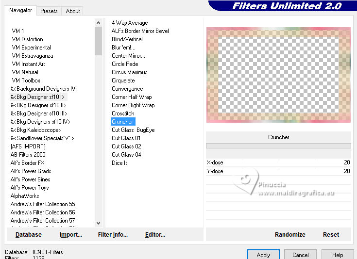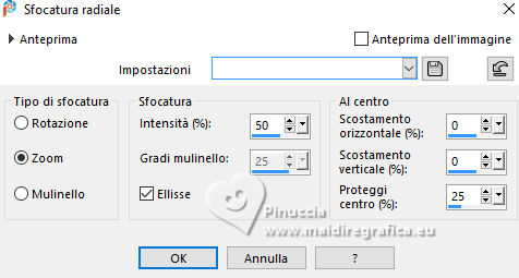 qui puoi trovare qualche risposta ai tuoi dubbi. Se l'argomento che ti interessa non è presente, ti prego di segnalarmelo. Questo tutorial è stato realizzato con PSP2020 e tradotto con PSPX9 e PSP2020, ma può essere eseguito anche con le altre versioni di PSP. Dalla versione X4, il comando Immagine>Rifletti è stato sostituito con Immagine>Capovolgi in orizzontale, e il comando Immagine>Capovolgi con Immagine>Capovolgi in verticale. Nelle versioni X5 e X6, le funzioni sono state migliorate rendendo disponibile il menu Oggetti. Con la nuova versione X7, sono tornati Rifletti>Capovolgi, ma con nuove varianti. Vedi la scheda sull'argomento qui ![]() Occorrente: a scelta: 1 immagine 1 misted 1 tube principale. Il resto del materiale ![]() (in questa pagina trovi i links ai siti dei creatori di tubes) Filtri: se hai problemi con i filtri, consulta la mia sezione filtri qui Filters Unlimited 2.0 qui &<Bkg Designer sf10I> - Cruncher (da importare in Unlimited) qui &<Background Kaleidoscope; - @Mirrored & Scaled (da importare in Unlimited) qui AFS IMPORT - sqborder2 qui I filtri AFS IMPORT si possono usare da soli o importati in Filters Unlimited (come fare vedi qui) Se un filtro fornito appare con questa icona ![]() non esitare a cambiare modalità di miscelatura e opacità secondo i colori utilizzati. Apri la maschera in PSP e minimizzala con il resto del materiale. ![]() 1. Apri una nuova immagine trasparente 900 x 600 pixels. Selezione>Seleziona tutto. 2. Apri la tua immagine e vai a Modifica>Copia. Torna al tuo lavoro e vai a Modifica>Incolla nella selezione Selezione>Deseleziona. 3. Effetti>Effetti di immagine>Motivo unico, con i settaggi standard. ![]() 4. Regola>Sfocatura>Sfocatura radiale. ![]() 5. Effetti>Plugins>AFS IMPORT - sqborder2 ![]() 6. Livelli>Duplica. Selezione>Seleziona tutto. Selezione>Modifica>Contrai - 40 pixels. 7. Premi sulla tastiera il tasto CANC ![]() Selezione>Deseleziona. 8. Effetti>Plugins>Filters Unlimited 2.0 - &<Bkg Designer sf10I> - Cruncher. ![]() 9. Effetti>Effetti di bordo>Aumenta di più. 10. Livelli>Duplica. Immagine>Ridimensiona, all'80%, tutti i livelli non selezionato. 11. Imposta il colore di primo piano con il colore bianco. Livelli>Nuovo livello raster. Riempi il livello con il colore bianco.12. Livelli>Nuovo livello maschera>Da immagine. Apri il menu sotto la finestra di origine e vedrai la lista dei files aperti. Seleziona la maschera Mask Tutorial 55 ![]() Effetti>Effetti di bordo>Aumenta di più. Livelli>Unisci>Unisci gruppo. 13. Effetti>Plugins>Filters Unlimited 2.0 - &<Bkg Designer sf10I> - Cruncher, con i settaggi precedenti. ![]() 14. Apri PNG Enfeite Tutorial 55 ![]() Modifica>Copia. Torna al tuo lavoro e vai a Modifica>Incolla come nuovo livello. 15. Immagine>Aggiungi bordatura, 2 pixels, simmetriche, colore bianco. Modifica>Copia 16. Selezione>Seleziona tutto. Immagine>Aggiungi bordatura, 35 pixels, simmetriche, con un colore qualsiasi. 17. Selezione>Inverti. Modifica>Incolla nella selezione 18. Effetti>Plugins>Filters Unlimited 2.0 - &<Bkg Kaleidoscope> - Mirrored & Scaled. ![]() 19. Effetti>Effetti 3D>Sfalsa ombra, colore nero. ![]() Ripeti l'Effetto Sfalsa ombra, verticale e orizzontale -3. Selezione>Deseleziona. 20. Apri il tuo misted e vai a Modifica>Copia. Torna al tuo lavoro e vai a Modifica>Incolla come nuovo livello. Ridimensiona, se necessario. 21. Apri il tuo tube e vai a Modifica>Copia. Torna al tuo lavoro e vai a Modifica>Incolla come nuovo livello. Ridimensiona, se necessario. Effetti>Effetti 3D>Sfalsa ombra, a scelta. 22. Immagine>Aggiungi bordatura, 1 pixel, simmetriche, colore nero. Firma il tuo lavoro e salva in formato jpg. Per il tube di questo esempio grazie Aprilshareables. ![]() ![]() Le vostre versioni. Grazie ![]() Puoi scrivermi se hai problemi o dubbi, o trovi un link che non funziona, o soltanto per un saluto. |