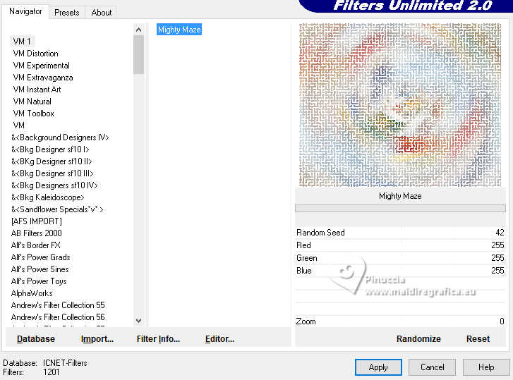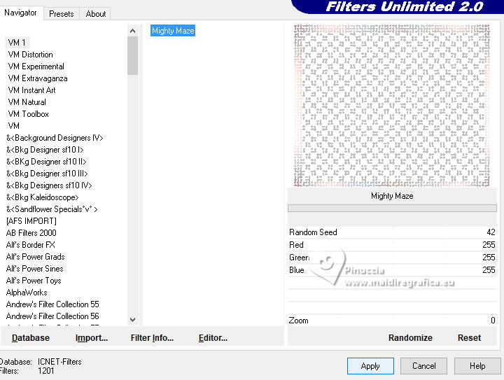 Effets>Modules Externes>Filters Unlimited 2.0 - VM 1 - Mighty Maze, par défaut.
