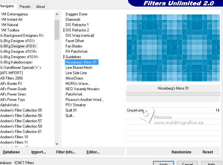 Effects>Plugins>Filters Unlimited 2.0 - &<Bkg Designer sf10II> - Hinzeberg's Mirror, default settings.
