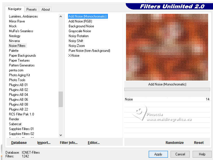 Effets>Modules Externes>Filters Unlimited 2 - Noise Filters - Add Noise (Monochromatic)
