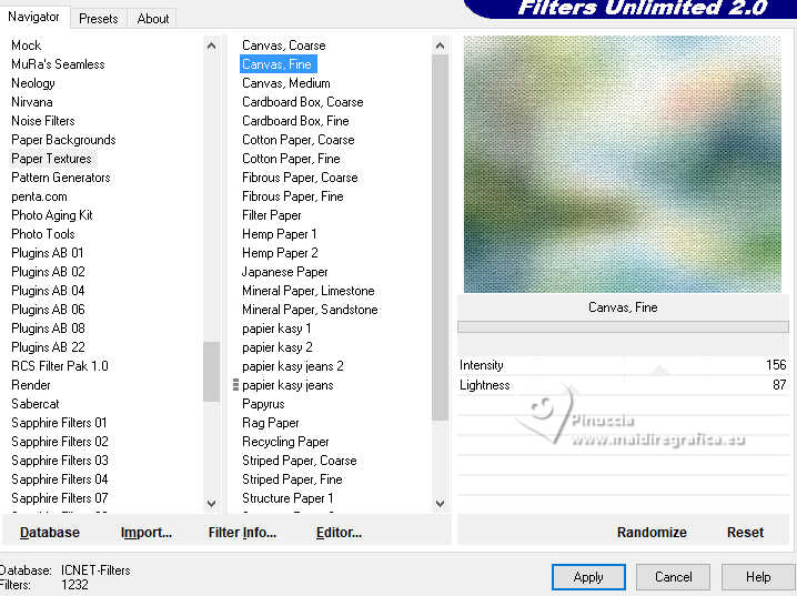 6. Effets>Modules Externes>Filters Unlimited 2.0 - Paper Textures - Canvas fine, par défaut.