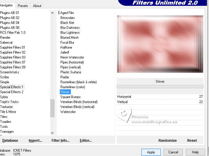 Effets>Modules Externes>Filters Unlimited 2.0 - Special Effects 1 - Shiver.