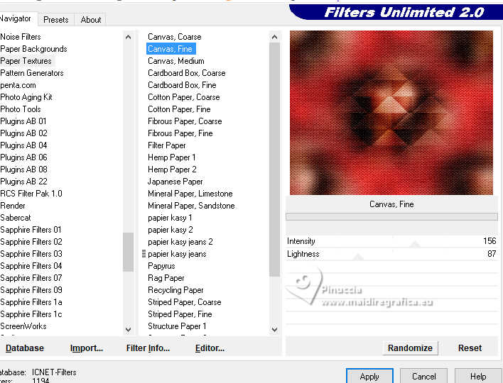 9. Effets>Modules Externes>Filters Unlimited 2.0 - Paper Textures - Canvas Fine, par défaut.