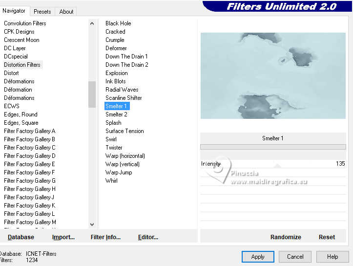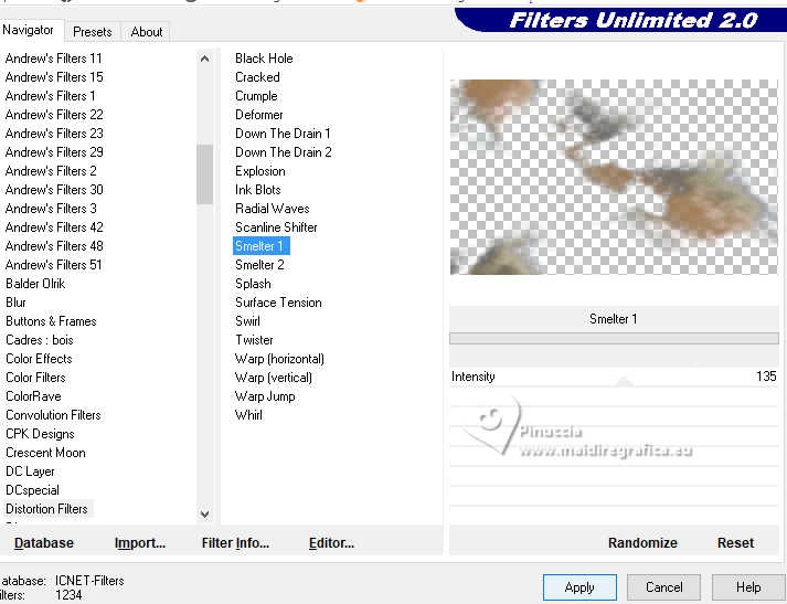 5. Effets>Modules Externes>Filters Unlimited 2.0 - Distortion Filters - Smelter 1