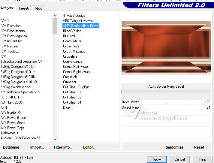 11. Effects>Plugins>Filters Unlimited 2 - &<Bkg Designer sf10 I> - Alf's Border Mirror Bevel, default settings.