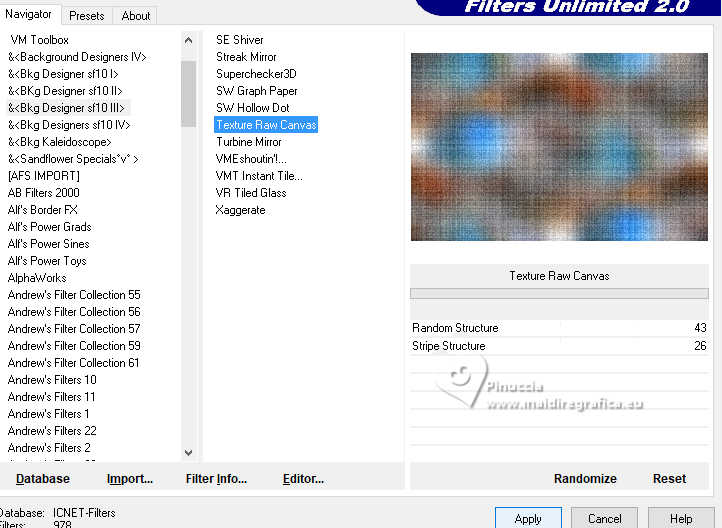 15. Effets>Modules Externes>Filters Unlimited 2.0 - &<Bkg Designer sf10III> - Texture Raw Canvas, par défaut.