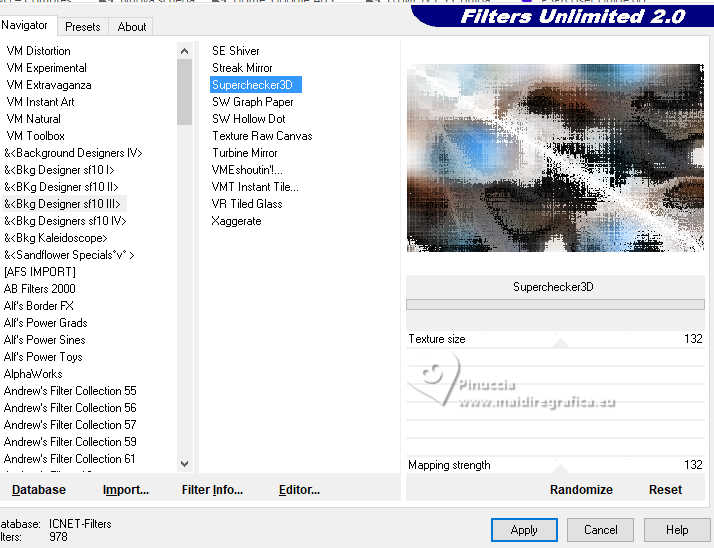 16. Effets>Modules Externes>Filters Unlimited 2.0 - &<Bkg Designer sf10III> - Superchecker 3D, par défaut.