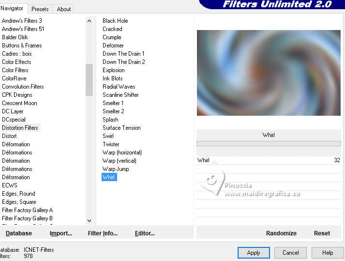Effets>Modules Externes>Filters Unlimited 2.0 - Distortion Filters - Whirl, par défaut.
