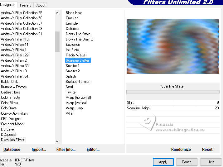 7. Effets>Modules Externes>Filters Unlimited 2.0 - Distortion Filters - Scanline Shifter, par défaut.