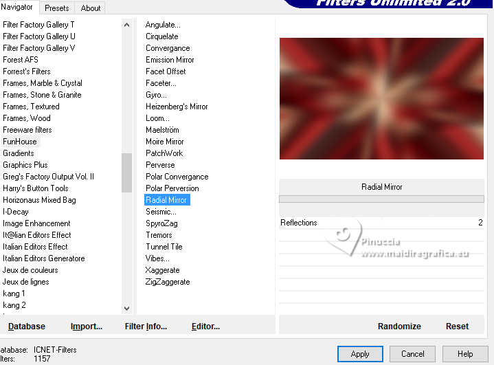 4. Effects>Plugins>Filters Unlimited 2.0 - Funhouse - Radial Mirror, default settings - 2 fois.
