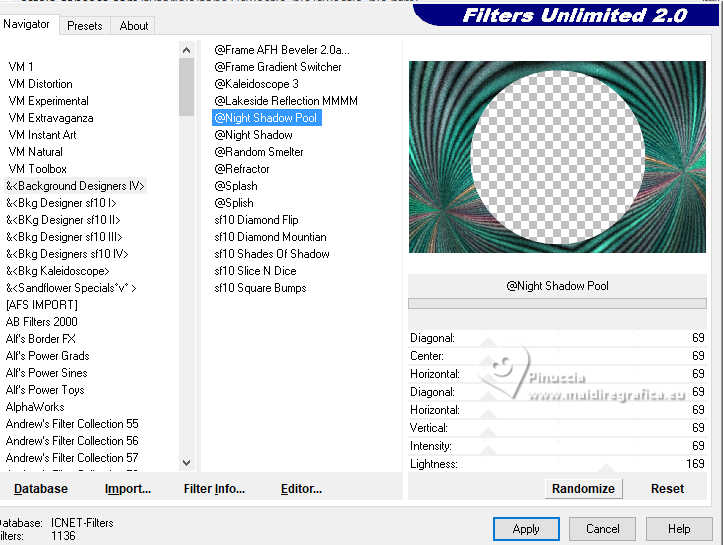 Effets>Modules Externes>Filters Unlimited 2.0 - &<Background Designers IV> - @Night Shadow Pool, par défaut.