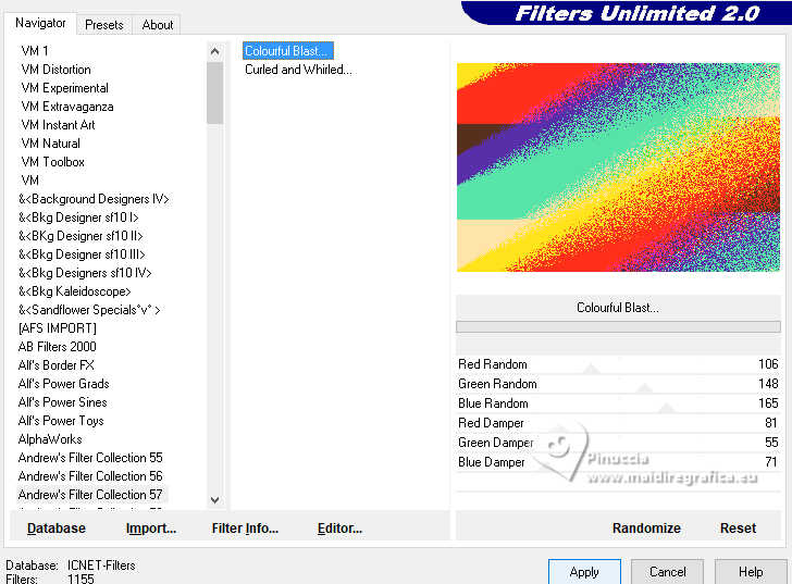 4. Effects>Plugins>Filters Unlimited 2.0 - Andrew's Filter Collection 57 - Colorful Blast, default settings.