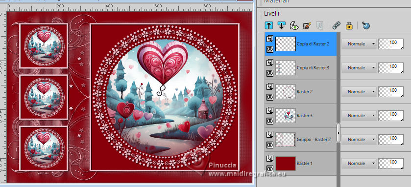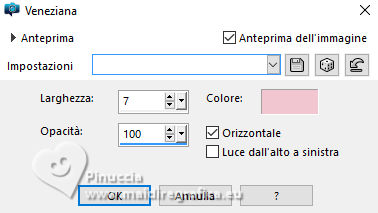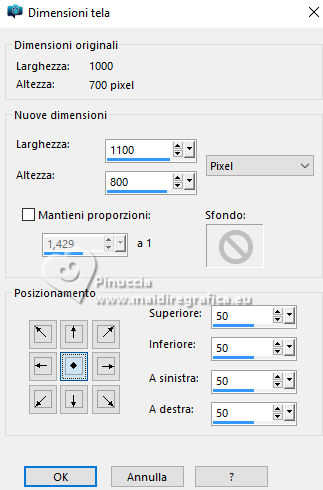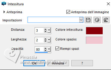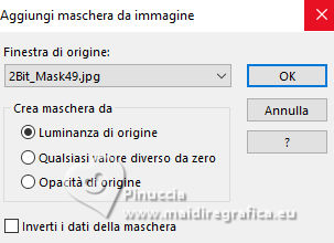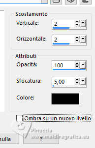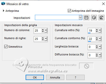 qui puoi trovare qualche risposta ai tuoi dubbi. Se l'argomento che ti interessa non è presente, ti prego di segnalarmelo. Questo tutorial è stato tradotto con PSPX9, PSPX8 e PSP2020, ma può essere realizzato anche con le altre versioni di PSP. Dalla versione X4, il comando Immagine>Rifletti è stato sostituito con Immagine>Capovolgi in orizzontale, e il comando Immagine>Capovolgi con Immagine>Capovolgi in verticale. Nelle versioni X5 e X6, le funzioni sono state migliorate rendendo disponibile il menu Oggetti. Con la nuova versione X7, sono tornati Rifletti>Capovolgi, ma con nuove varianti. Vedi la scheda sull'argomento qui Grazie ai creatori dei tubes che mettono a disposizione il loro lavoro in vari gruppi di condivisione. Rispetta il lavoro degli autori, non cambiare il nome del file e non cancellare il watermark. traduzione francese qui traduzione inglese qui Le vostre versioni qui![]() Occorrente: Materiale A scelta: un'immagine di sfondo e il tube principale. Il resto del materiale ![]() Versioni con miei tubes da immagini Pinterest (in questa pagina trovi i links ai siti dei creatori di tubes) ![]() ![]() Nessuno ![]() non esitare a cambiare modalità di miscelatura e opacità secondo i colori utilizzati. Nelle ultime versioni di PSP non c'é il gradiente di primo piano/sfondo (Corel_06_029) Puoi usare i gradienti delle versioni precedenti. Trovi qui i gradienti Corel X. ![]() Apri la maschera in PSP e minimizzala con il resto del materiale. 1. Scegli dai tuoi tubes un colore chiaro e un colore scuro. ![]() Apri una nuova immagine trasparente 1000 x 700 pixels. Riempi l'immagine trasparente con il colore scuro.Livelli>Nuovo livello raster. Riempi il livello con il colore chiaro.Livelli>Nuovo livello maschera>Da immagine. Apri il menu sotto la finestra di origine e vedrai la lista dei files aperti. Seleziona la maschera 28it_Mask49. ![]() Effetti>Effetti di bordo>Aumenta. Livelli>Unisci>Unisci gruppo. Effetti>Effetti 3D>Sfalsa ombra, colore nero. ![]() 2. Apri deco-1©ILR ![]() Modifica>Copia. Torna al tuo lavoro e vai a Modifica>Incolla come nuovo livello. Attiva lo strumento Cambio colore ![]() e clicca sul tube con il tasto sinistro del mouse per usare il colore chiaro. Tasto K per attivare lo strumento Puntatore ![]() Posizione X: 345,00 - Posizione Y: 53,00. ![]() Effetti>Effetti 3D>Sfalsa ombra, con i settaggi precedenti. ![]() Livelli>Duplica. Immagine>Ridimensiona, al 28%, tutti i livelli non selezionato. Posizione X: 69,00 - Posizione Y: 58,00. ![]() Livelli>Duplica. Livelli>Unisci>Unisci giù. 3. Livelli>Duplica. Immagine>Rifletti>Rifletti verticalmente (Immagine>Capovolgi). Livelli>Duplica. Tasto K per attivare lo strumento Puntatore ![]() Posizione X: 69,00 - Posizione Y: 267,00. ![]() Livelli>Unisci>Unisci giù - 2 volte. Apri il tuo tube di sfondo e vai a Modifica>Copia. Torna al tuo lavoro e vai a Modifica>Incolla come nuovo livello. Immagine>Ridimensiona, se e quanto necessario. Regola>Messa a fuoco>Metti a fuoco. Sposta l'immagine sul cerchio grande.Livelli>Duplica. Livelli>Unisci>Unisci giù. Livelli>Disponi>Sposta giù. 4. Livelli>Duplica. Immagine>Ridimensiona, al 28%, tutti i livelli non selezionato. Regola>Messa a fuoco>Metti a fuoco. Sposta l'immagine a sinistra nel cerchio superiore.Livelli>Duplica - e sposta questa immagine nel cerchio centrale.Livelli>Duplica - e sposta questa immagine nel cerchio inferiore.Livelli>Unisci>Unisci giù - 2 volte. Livelli>Disponi>Sposta giù. Attiva il livello superiore. ![]() Apri deco-2©ILR ![]() Modifica>Copia. Torna al tuo lavoro e vai a Modifica>Incolla come nuovo livello. Tasto K per attivare lo strumento Puntatore ![]() Posizione X: 343,00 - Posizione Y: 54,00. ![]() Effetti>Effetti 3D>Sfalsa ombra ![]() 5. Apri deco-3©ILR ![]() Modifica>Copia. Torna al tuo lavoro e vai a Modifica>Incolla come nuovo livello. Posizione X: 53,00 - Posizione Y: 51,00. ![]() ![]() Livelli>Unisci>Unisci visibile. Selezione>Seleziona tutto. Immagine>Dimensioni tela - 1100 x 800 pixels ![]() Selezione>Inverti. Passa il colore di primo piano a Gradiente di primo piano/sfondo, stile Sprazzo di luce ![]() Riempi la selezione con il gradiente.6. Selezione>Inverti. Effetti>Effetti 3D>Sfalsa ombra ![]() Selezione>Inverti. Selezione>Modifica>Contrai - 6 pixels. Inverti i colori del gradiente, cliccando sulla piccola freccia tra le due palette. ![]() Riempi la selezione con il gradiente.Effetti>Effetti di trama>Intessitura colore intessitura: colore scuro colore spazio: colore chiaro ![]() Selezione>Modifica>Contrai - 6 pixels. 7. Inverti nuovamente i colori del gradiente ![]() Riempi la selezione con il gradiente.Effetti>Effetti di trama>Veneziana - colore chiaro. ![]() Effetti>Effetti di bordo>Aumenta. Selezione>Modifica>Contrai - 6 pixels. Inverti ancora i colori del gradiente ![]() e riempi la selezione con il gradiente.Effetti>Effetti di trama>Mosaico di vetro. ![]() Selezione>Deseleziona. 8. Apri il tube principale e vai a Modifica>Copia. Torna al tuo lavoro e vai a Modifica>Incolla come nuovo livello. Immagine>ridimensiona, se e quanto necessario. Regola>Messa a fuoco>Metti a fuoco. Effetti>Effetti 3D>Sfalsa ombra, con i settaggi precedenti. Immagine>Aggiungi bordatura, 2 pixels, simmetriche, colore scuro. Immagine>Aggiungi bordatura, 3 pixels, simmetriche, colore chiaro. Immagine>Aggiungi bordatura, 2 pixels, simmetriche, colore scuro. Immagine>Ridimensiona, 1000 pixels di larghezza, tutti i livelli selezionato. Regola>Messa a fuoco>Metti a fuoco. Firma il tuo lavoro su un nuovo livello. Livelli>Unisci>Unisci tutto e salva in formato jpg. Versione con miei tubes da immagini Pinterest ![]() ![]() Se hai problemi o dubbi, o trovi un link non funzionante, o anche soltanto per un saluto, scrivimi. |