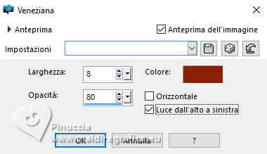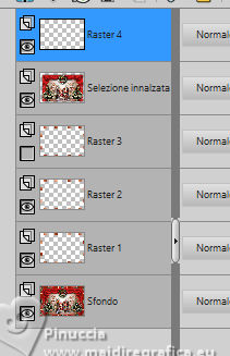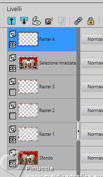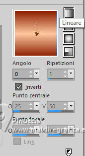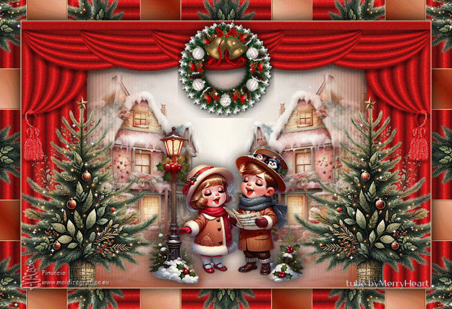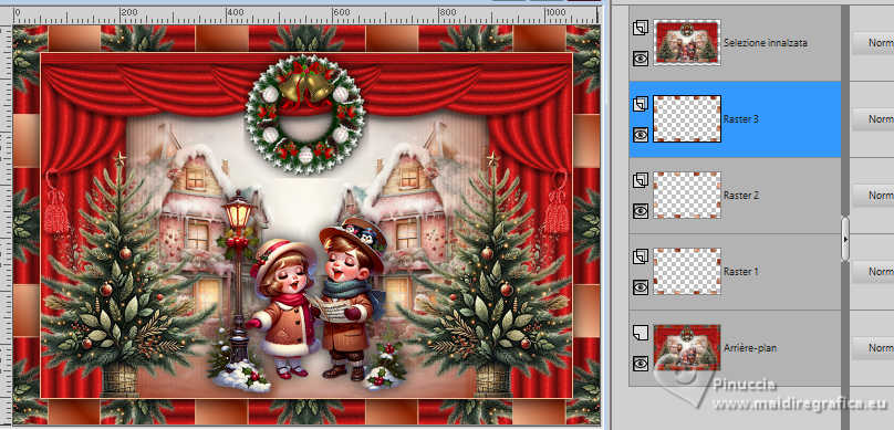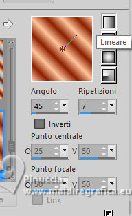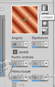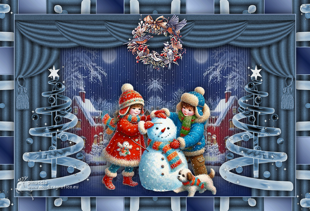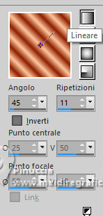 qui puoi trovare qualche risposta ai tuoi dubbi. Se l'argomento che ti interessa non è presente, ti prego di segnalarmelo. Questo tutorial è stato tradotto con PSPX9, PSPX8 e PSP2020, ma può essere realizzato anche con le altre versioni di PSP. Dalla versione X4, il comando Immagine>Rifletti è stato sostituito con Immagine>Capovolgi in orizzontale, e il comando Immagine>Capovolgi con Immagine>Capovolgi in verticale. Nelle versioni X5 e X6, le funzioni sono state migliorate rendendo disponibile il menu Oggetti. Con la nuova versione X7, sono tornati Rifletti>Capovolgi, ma con nuove varianti. Vedi la scheda sull'argomento qui Grazie ai creatori dei tubes che mettono a disposizione il loro lavoro in vari gruppi di condivisione. Rispetta il lavoro degli autori, non cambiare il nome del file e non cancellare il watermark. traduzione francese qui traduzione inglese qui Le vostre versioni qui![]() Occorrente: Materiale ![]() Per il tube grazie MerryHeart (in questa pagina trovi i links ai siti dei creatori di tubes) ![]() ![]() Nessuno Animation Shop qui ![]() ![]() non esitare a cambiare modalità di miscelatura e opacità secondo i colori utilizzati. Nelle ultime versioni di PSP non c'é il gradiente di primo piano/sfondo (Corel_06_029) Puoi usare i gradienti delle versioni precedenti. Trovi qui i gradienti Corel X. ![]() 1. Scegli dai tuoi tubes un colore chiaro e un colore scuro. ![]() Passa il colore di primo piano a Gradiente di primo piano/sfondo, stile Lineare. ![]() Apri una nuova immagine trasparente 1000 x 650 pixels. Riempi l'immagine trasparente con il gradiente.Effetti>Effetti di trama>Veneziana - colore di sfondo. ![]() Apri rideau ![]() Modifica>Copia. Torna al tuo lavoro e vai Modifica>Incolla come nuovo livello. Regola>Messa a fuoco>Metti a fuoco. Effetti>Effetti 3D>Sfalsa ombra, colore nero. ![]() Apri MM-AI-Tube-00(100)-paper ![]() Modifica>Copia. Torna al tuo lavoro e vai Modifica>Incolla come nuovo livello. Livelli>Disponi>Sposta giù. Regola>Messa a fuoco>Metti a fuoco. 2. Attiva il livello superiore. Apri il tube principale AI VISION-LAMP CAROL KIDS 24 ![]() Modifica>Copia. Torna al tuo lavoro e vai Modifica>Incolla come nuovo livello. Immagine>Ridimensiona, se necessario - per il tube fornito ho ridimensionato al 65%, tutti i livelli non selezionato. Regola>Messa a fuoco>Metti a fuoco. Sposta il tube in basso![]() Effetti>Effetti 3D>Sfalsa ombra, con i settaggi precedenti. Apri il tube AI VISION-RUSTIC FARM TREE 13 ![]() Modifica>Copia. Torna al tuo lavoro e vai Modifica>Incolla come nuovo livello. Immagine>Ridimensiona, se necessario - per il tube fornito ho ridimensionato all'80%, tutti i livelli non selezionato. Regola>Messa a fuoco>Metti a fuoco. Effetti>Effetti 3D>Sfalsa ombra, con i settaggi precedenti. 4. Sposta il tube a destra o a sinistra![]() Livelli>Duplica. Immagine>Rifletti>Rifletti orizzontalmente. Livelli>Unisci>Unisci giù. Apri couronne ![]() Modifica>Copia. Torna al tuo lavoro e vai Modifica>Incolla come nuovo livello. Sposta il tube in alto sul bordo.(Oggetti>Allinea>Superiore) ![]() Effetti>Effetti 3D>Sfalsa ombra, con i settaggi precedenti. Immagine>Aggiungi bordatura, 2 pixels, simmetriche, colore chiaro. 4. Selezione>Seleziona tutto. Immagine>Aggiungi bordatura, 50 pixels, simmetriche, colore scuro. Selezione>Inverti. Effetti>Effetti di riflesso>Caleidoscopio. ![]() Di nuovo Selezione>Inverti. Selezione>Innalza selezione a livello. Effetti>Effetti 3D>Sfalsa ombra, colore nero. ![]() Selezione>Deseleziona. 5. Attiva il livello inferiore. Attiva lo strumento Bacchetta magica ![]() e clicca su tutti i rettangoli colorati per selezionarli. ![]() Cambia i settaggi del gradiente. ![]() Livelli>Nuovo livello raster. Riempi la selezione con il gradiente.Livelli>Nuovo livello raster. Inverti i colori del gradiente. ![]() Riempi la selezione con il gradiente.Livelli>Nuovo livello raster. Cambia ancora i settaggi del gradiente. ![]() attenzione, se hai fatto confusione con l'inversione dei colori, questo settaggio deve avere la parte chiara al centro ![]() Riempi la selezione con il gradiente.Selezione>Deseleziona. Dovresti avere questo ![]() 6. Attiva il livello superiore. Immagine>Ridimensiona, 1000 pixels di larghezza, tutti i livelli selezionato. Firma il tuo lavoro su un nuovo livello. Chiudi i livelli Raster 2 e Raster 3. ![]() Modifica>Copia Speciale>Copia Unione. Apri Animation Shop e vai a Modifica>Incolla>Incolla come nuova animazione. Torna in PSP. Apri il livello Raster 2. ![]() 7. Modifica>Copia Speciale>Copia Unione. Torna in Animation Shop e vai a Modifica>Incolla>Incolla dopo il fotogramma corrente. Di nuovo in PSP. Apri il livello Raster 3. Modifica>Copia Speciale>Copia Unione. In Animation Shop e vai a Modifica>Incolla>Incolla dopo il fotogramma corrente. E avrai una animazione composta da 3 fotogrammi. Se tutto è ok e controlli il risultato cliccando su Visualizza ![]() dovresti avere questo ![]() 8. Sposta il cursore sotto l'immagine verso sinistra e clicca sul primo fotogramma per selezionarlo. Modifica>Seleziona tutto. Apri stars ![]() Anche questa animazione è composta da 3 fotogrammi. Modifica>Seleziona tutto. Modifica>Copia. Attiva il tuo lavoro e vai a Modifica>Incolla>Incolla nel fotogramma selezionato. Posiziona l'animazione sulla corona e, quando hai trovato la posizione corretta, clicca con il tasto sinistro del mouse. 9. Ripeti Modifica>Incolla>Incolla nel fotogramma selezionato, tutte le volte che vuoi per aggiungere altre gif sulla corona, sugli alberi di natale. Nel mio esempio ho aggiunto le stelline anche nei quattro angoli. Assicurati sempre che il cursore sotto l'immagine sia a sinistra. Controlla il risultato cliccando su Visualizza ![]() e salva in formato gif. se l'animazione ti sembra troppo veloce, vai a Animazione>Proprietà del fotogramma e aumenta la durata, per l'esempio sotto, ho impostato la durata a 25. (più alto è il settaggio, più è lenta l'animazione ![]() ![]() Versione con miei tubes da immagi